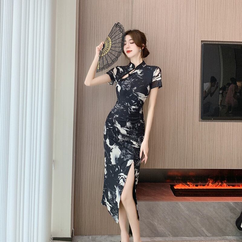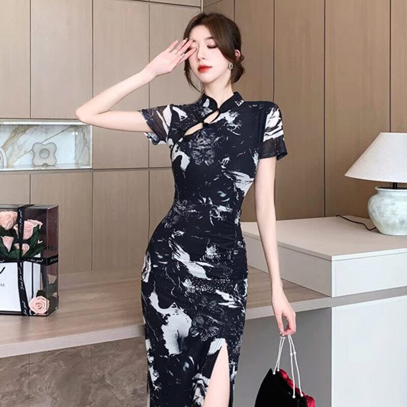 -スタイルチャイナドレス若いスタイルハイエンド気質女神ファン夏改良された中国風メッシュガーゼミドル丈ドレス サマー 夏物 yeyij56271387087
