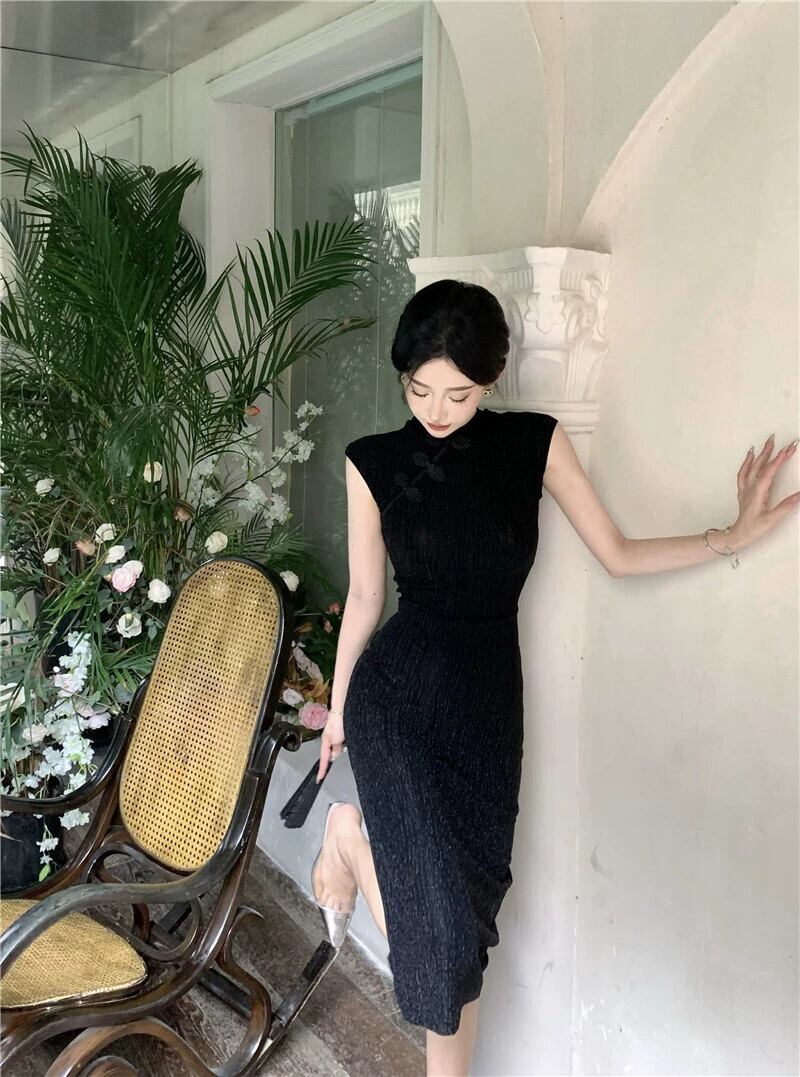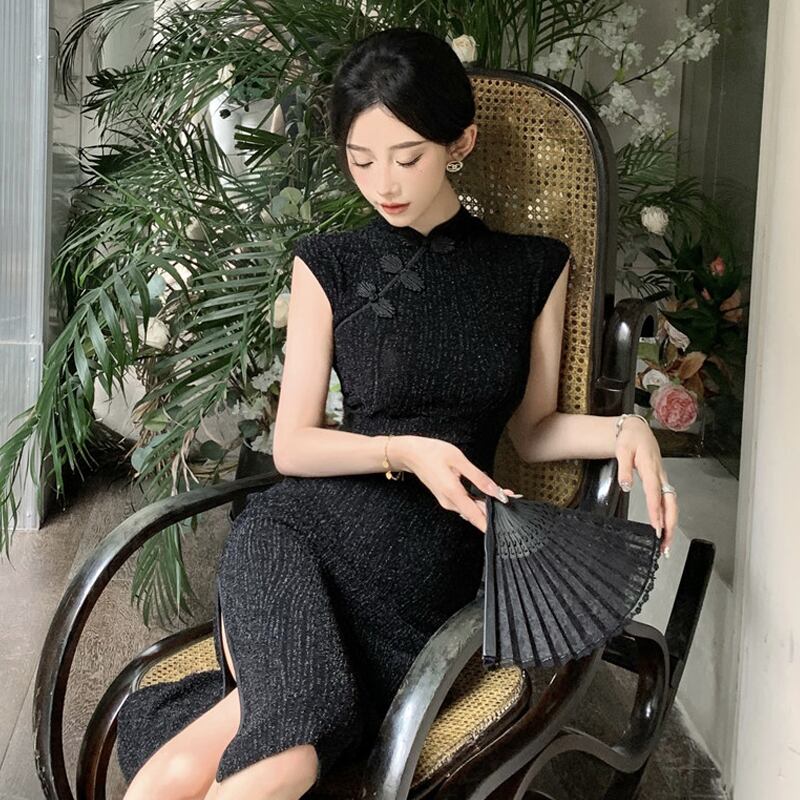 -スタイルの高貴なチャイナドレス、若いスタイル、ハイエンドの気質、黒の光沢のあるシルク、中国風のドレスの毎日の改良版 ブラック yeyij54600268748