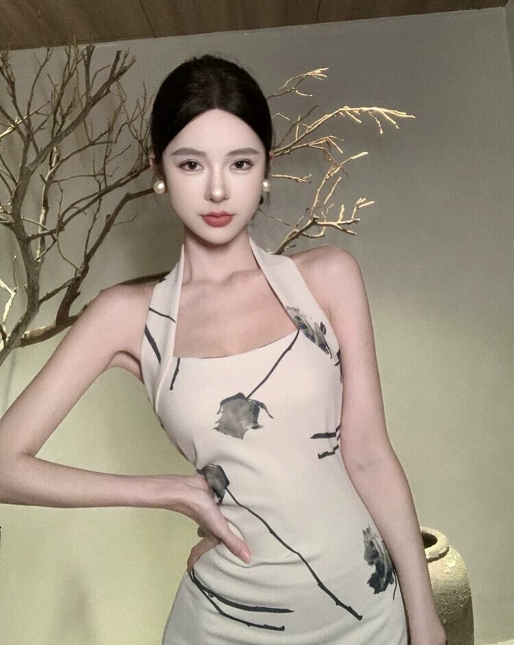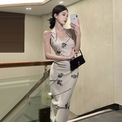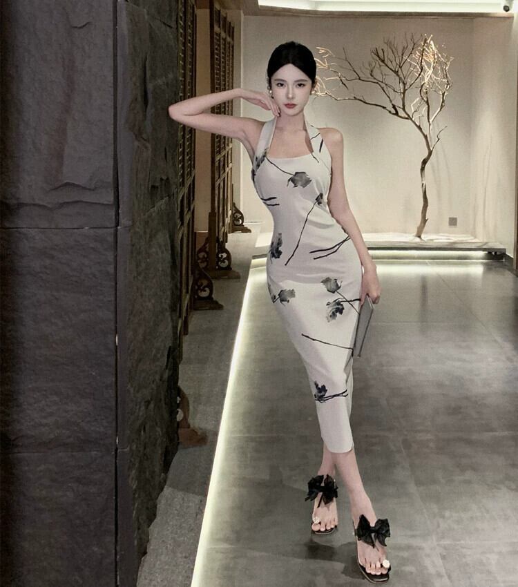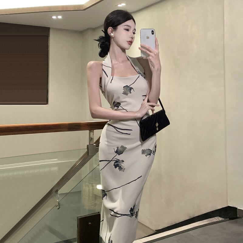 イブニングドレスハイエンドライトラグジュアリーニッチハイエンドレトロプリント気質セクシーなバックレスミッドレングスホルターネックドレス yeyij36018930148