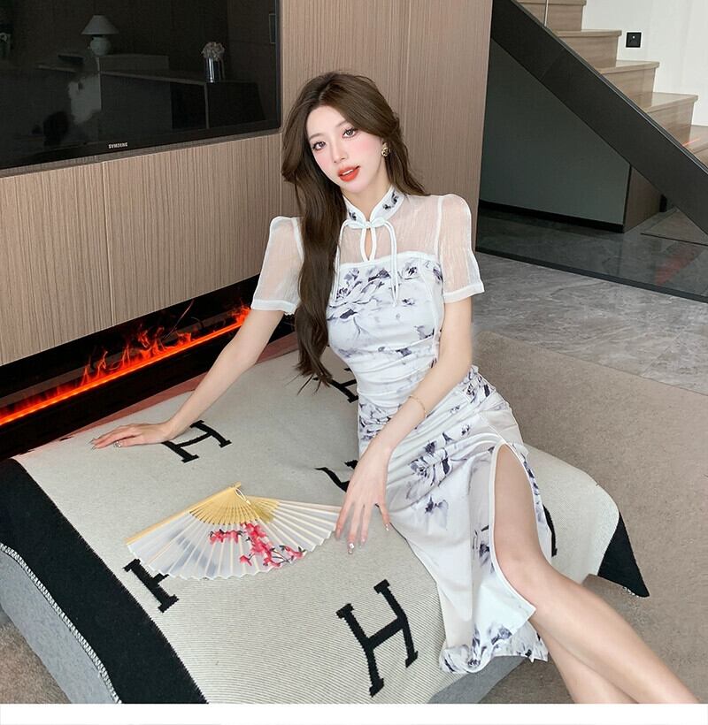 -スタイルチャイナドレス、若いスタイル、ハイエンドの気質、毎日の中国風メッシュステッチ改良版ミドル丈ドレス yeyij53778053834