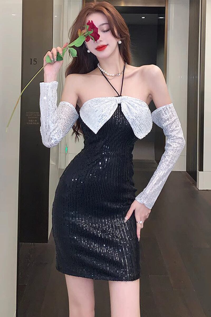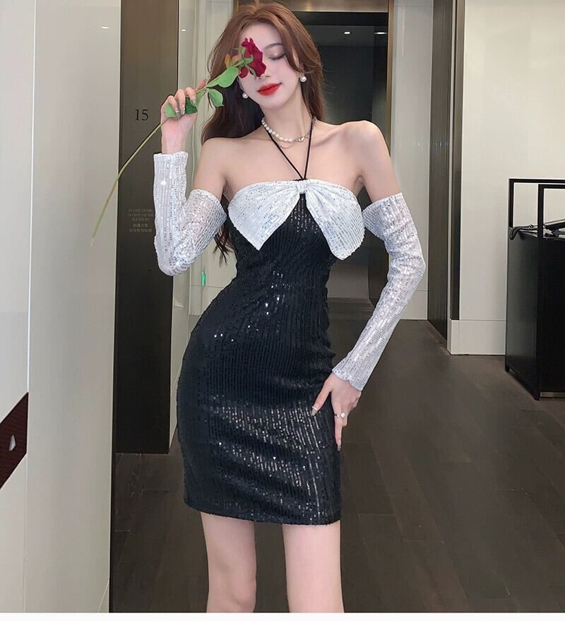 小さなドレスの女性フレンチハイエンドスパンコール年次パーティー気質セクシーなワンショルダー長袖チューブトップホルタードレス ロング yeyij17389550769