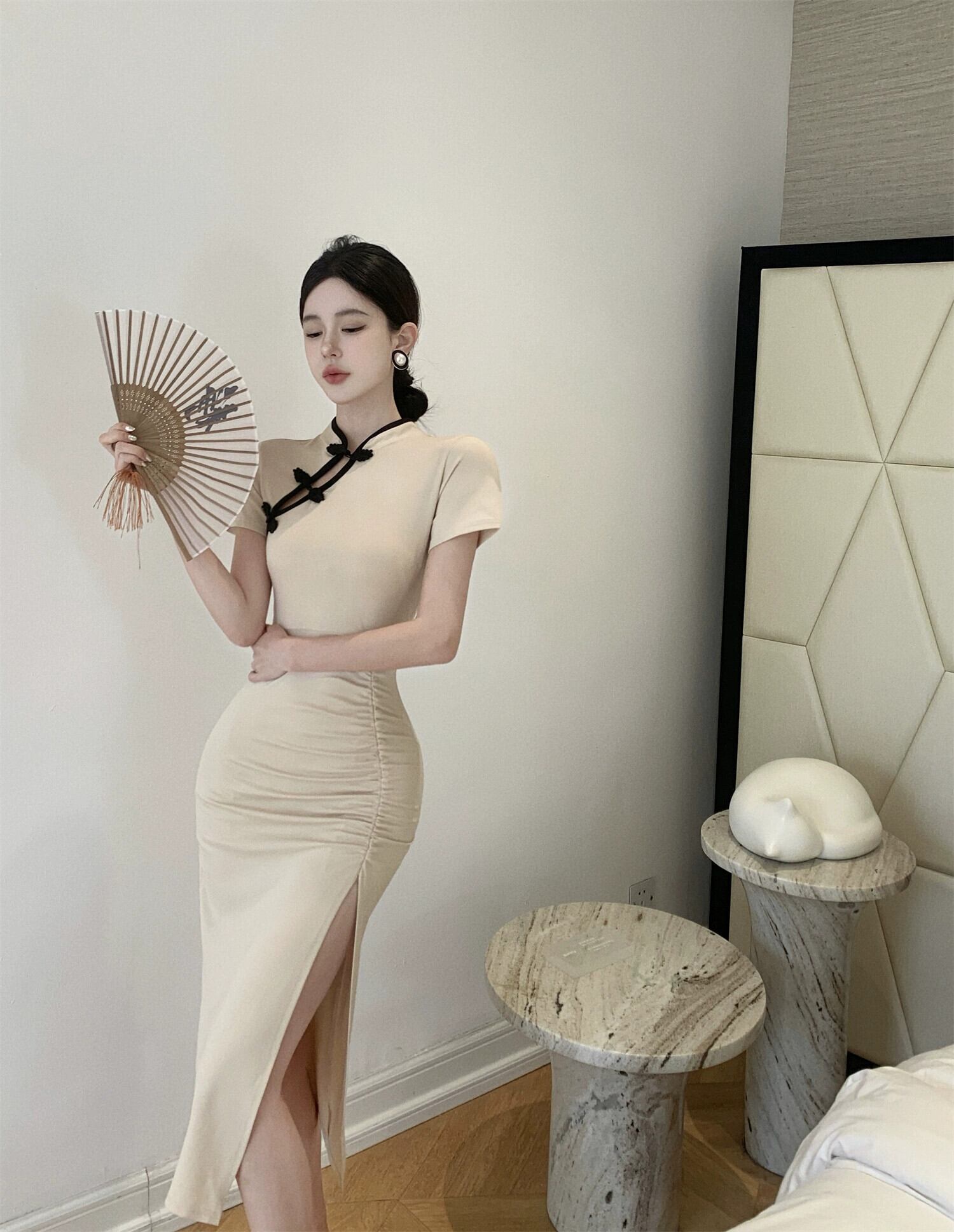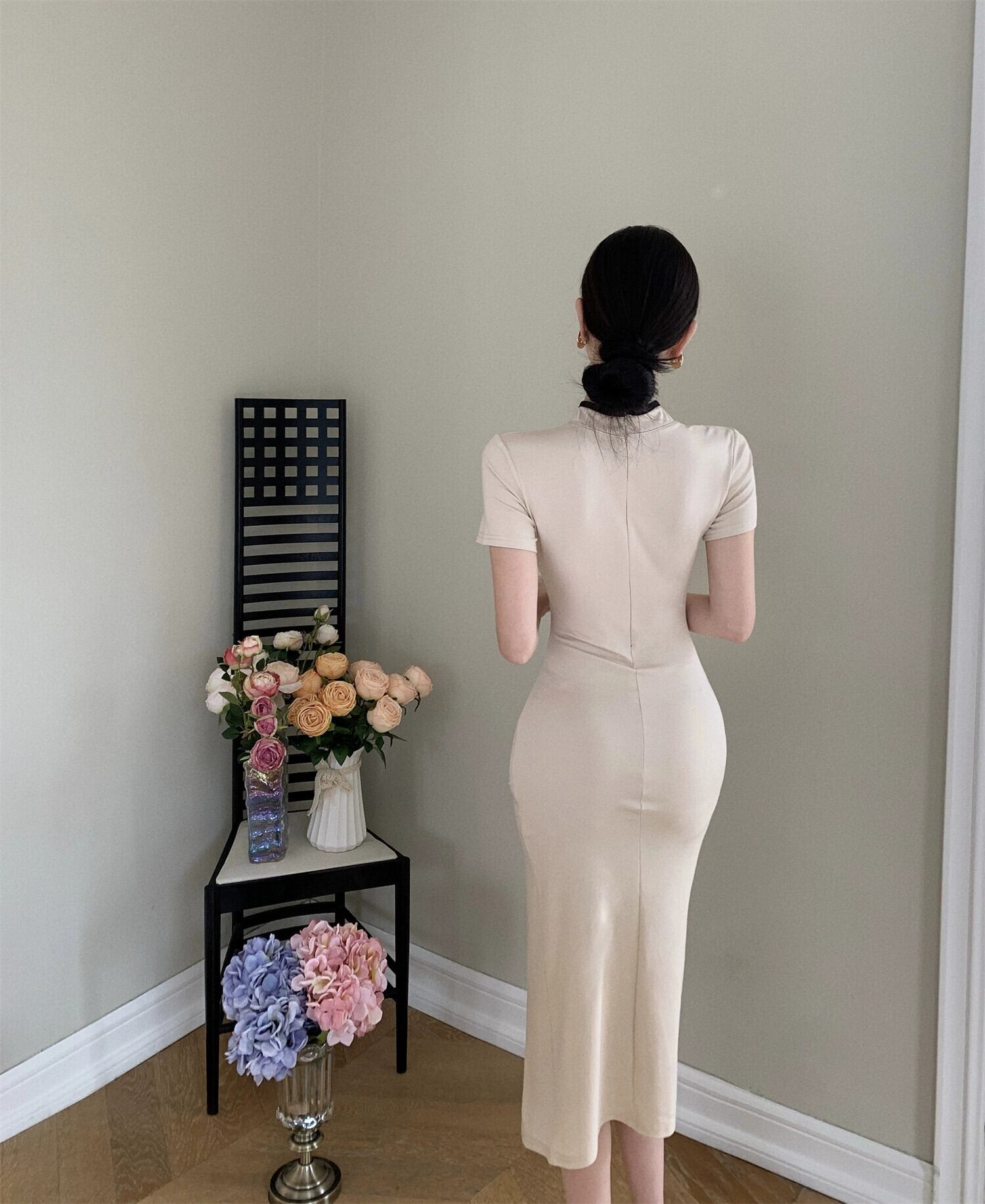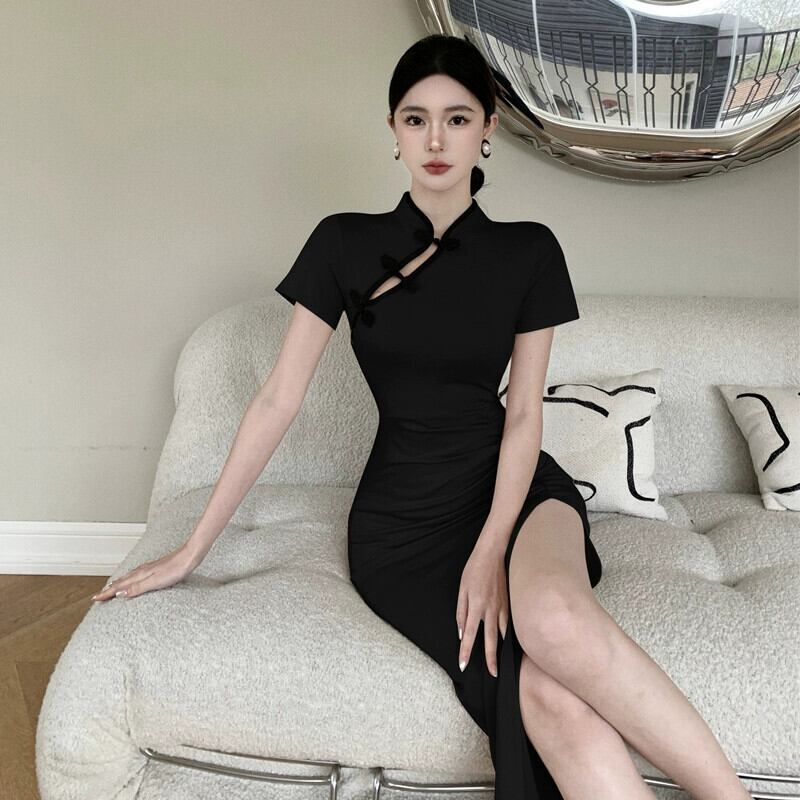 チャイナドレス 2023 新しい気質の女神スタイルの若い黒の改良された毎日の中国風のミドル丈のドレス ブラック yeyij36042697862