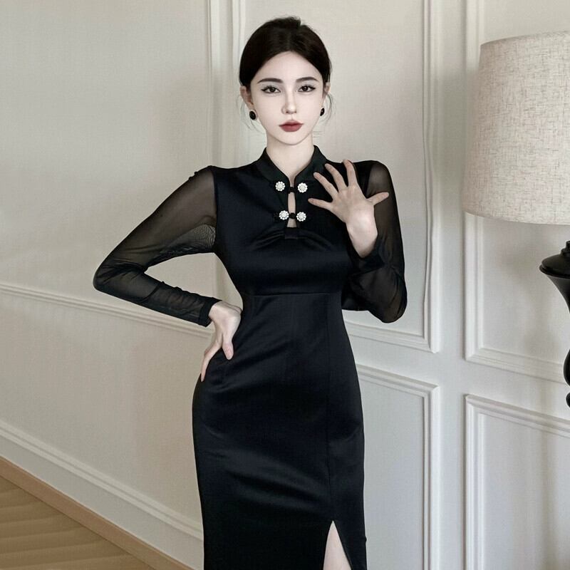 スタイルチャイナドレス若いスタイルハイエンド気質初秋婦人服若いスタイルメッシュスプライシングミドルドレス オータム 秋物 yeyij61678891673