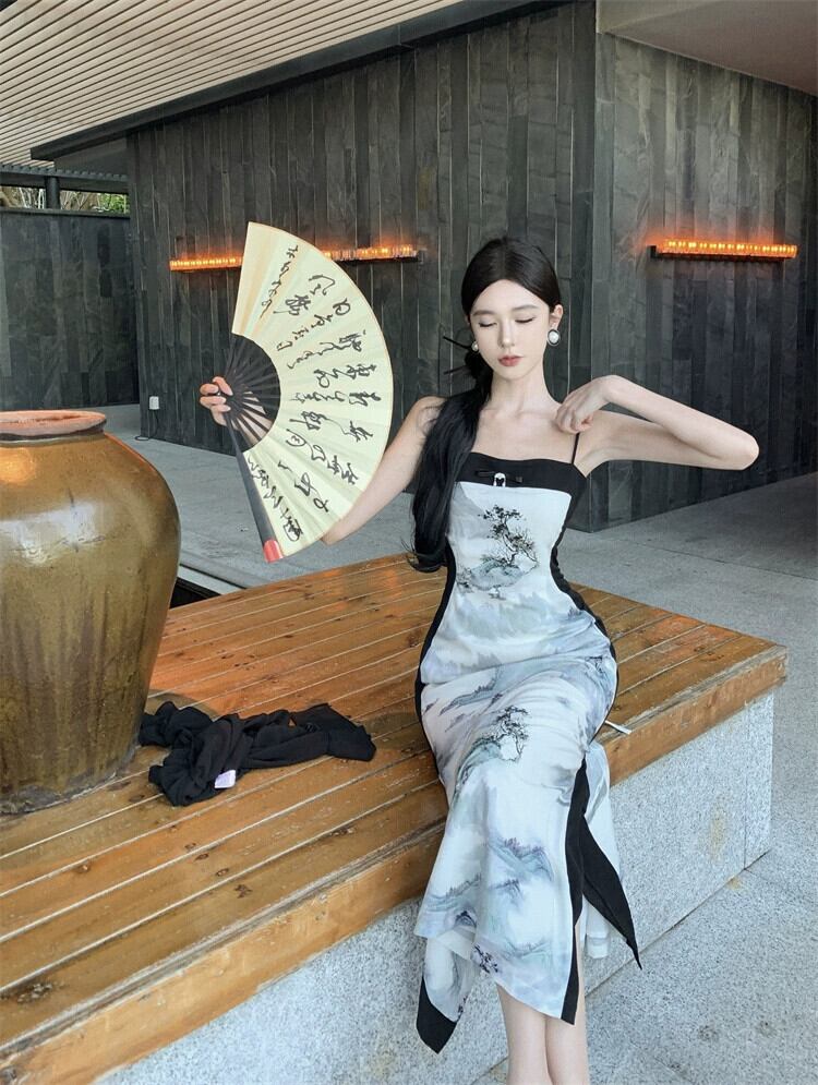 初秋のスーツの女性の長袖シフォンショール日焼け防止カーディガン + 中国風水墨画チャイナ サスペンダー ドレス ロング オータム 秋物 yeyij35290771387