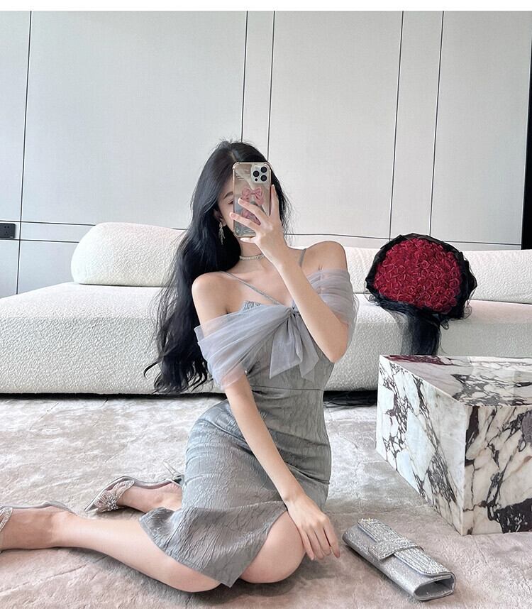 ヘップバーン スタイルのイブニング ドレス、フェミニン、ライト、ラグジュアリー、ニッチ、ハイエンド、フレンチ セクシー、見事なワンショルダー サスペンダー ドレス yeyij21617628222