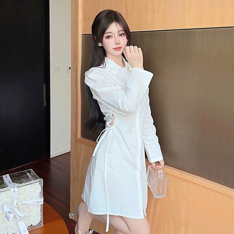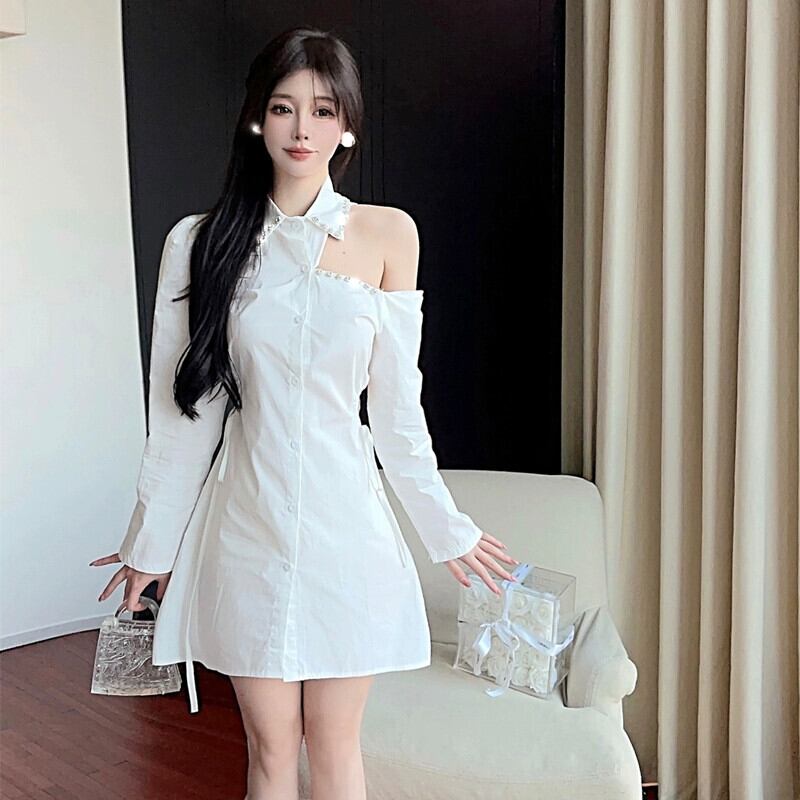 ニッチな気質の初秋デザインのシャツドレス女性長袖ウエスト痩身セクシーなワンショルダーオフショルダードレス ロング オータム 秋物 yeyij95666583979