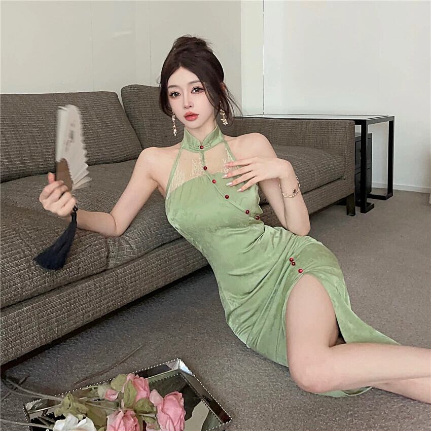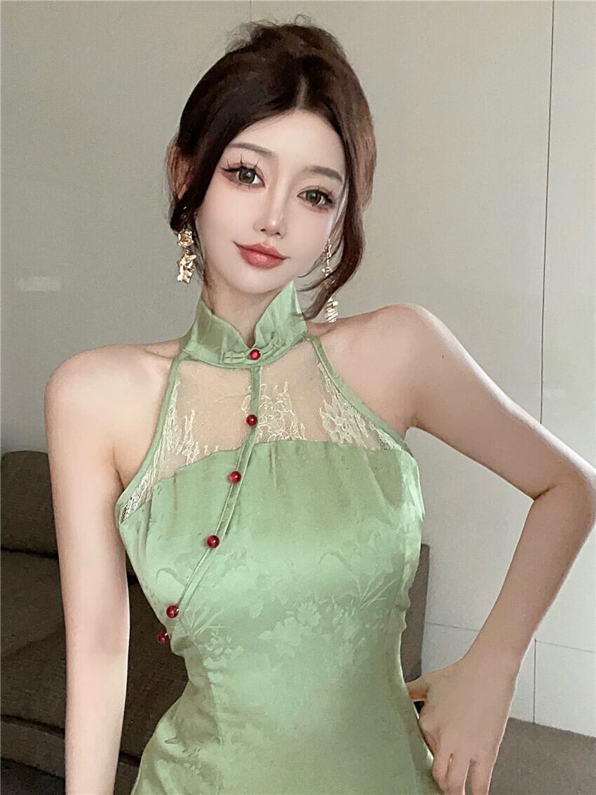 グリーンの新しいスタイルのチャイナドレス若いスタイルのハイエンド気質生放送アンカー服セクシーなレーススプライシングホルターネックドレス yeyij70823190578