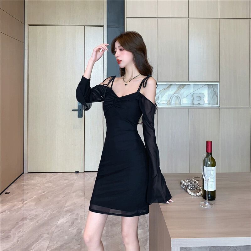 生放送服女性アンカー pogenic ハイエンド純粋な欲望ネクタイ黒のセクシーなワンショルダー長袖サスペンダードレス ロング ブラック ピュア yeyij58650877803