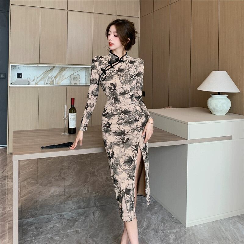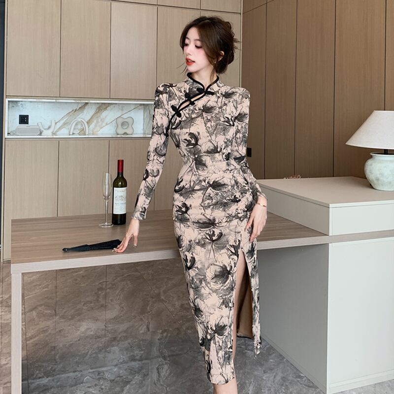 初秋の女性のレトロな中国風プリントセクシーなスリットミッドレングススリット長袖修正チャイナドレス ロング オータム 秋物 yeyij6200010954