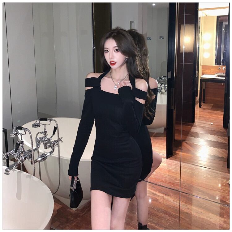 生放送服女性アンカー pogenic ハイエンド純粋な欲望黒見事なセクシーなワンショルダー ホルターネック オフショルダー ドレス ブラック ピュア yeyij91812825155
