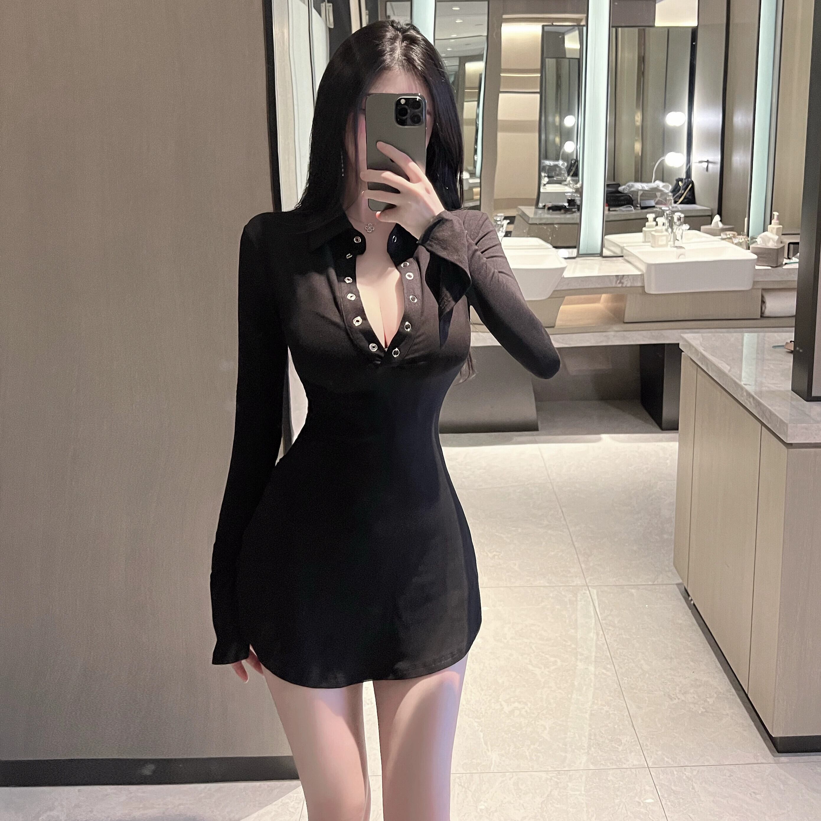 生放送服女性アンカー pogenic ハイエンド純粋な欲望ポロ襟 T シャツドレスセクシーな超短長袖ヒップカバードレス ショート ロング Tシャツ ピュア yeyij57045284671