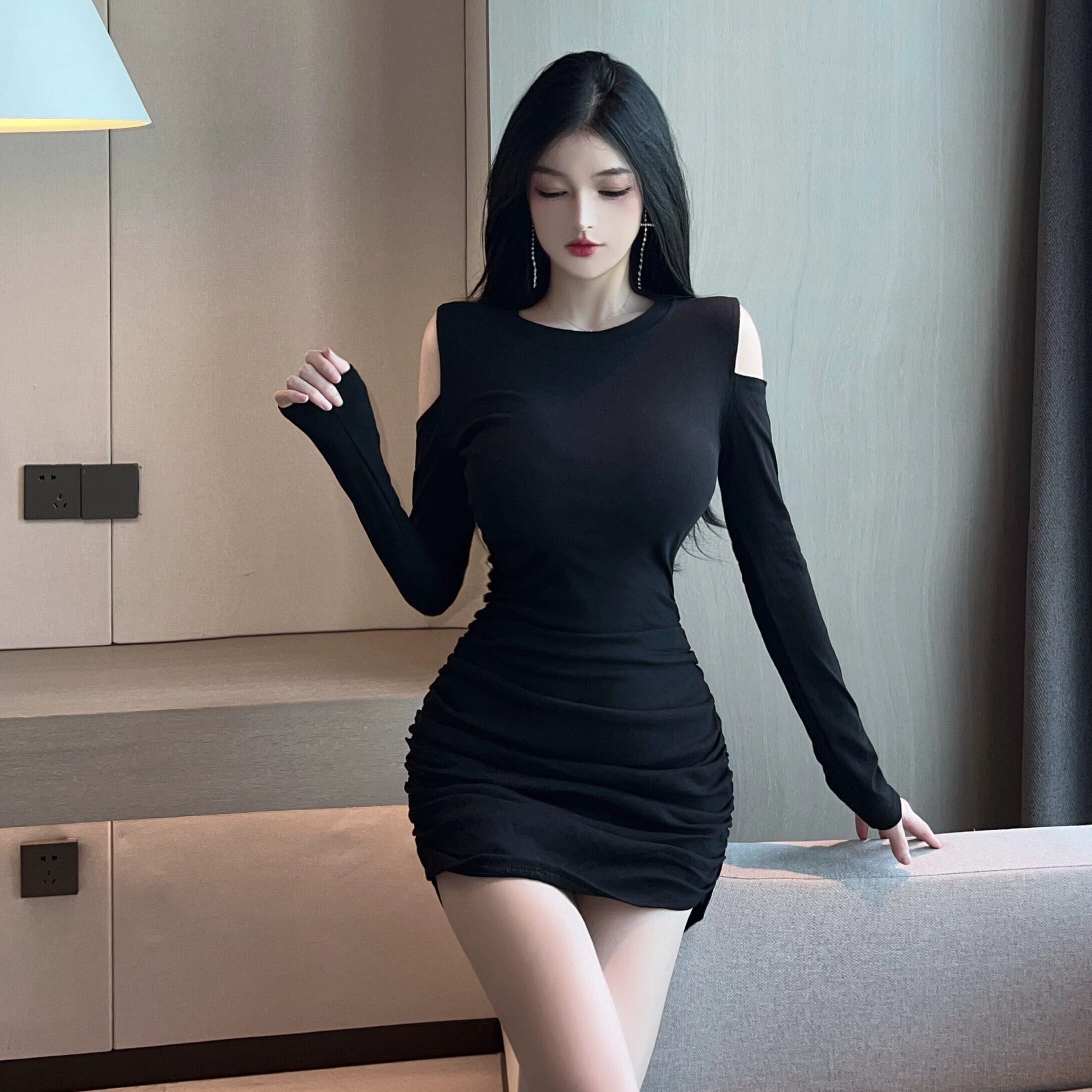 生放送服女性アンカー pogenic ハイエンド純粋な欲望ネクタイセクシーな中空オフショルダー長袖底ドレス ロング ピュア yeyij57479606226