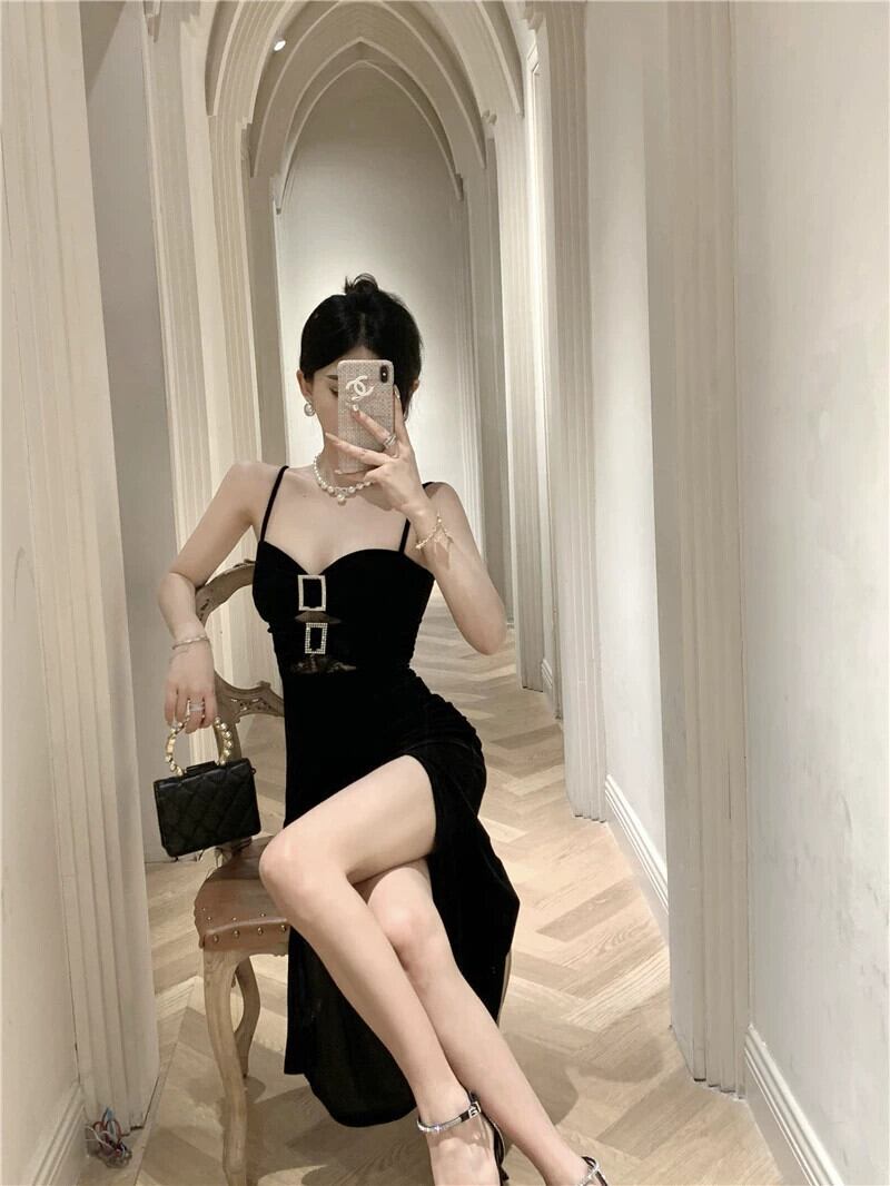ヘップバーン スタイルのイブニング ドレス、フェミニン、ライト ラグジュアリー ニッチ、ハイエンド フレンチ セクシー ブラック ゴールド ベルベット サスペンダー ドレス yeyij64904416331