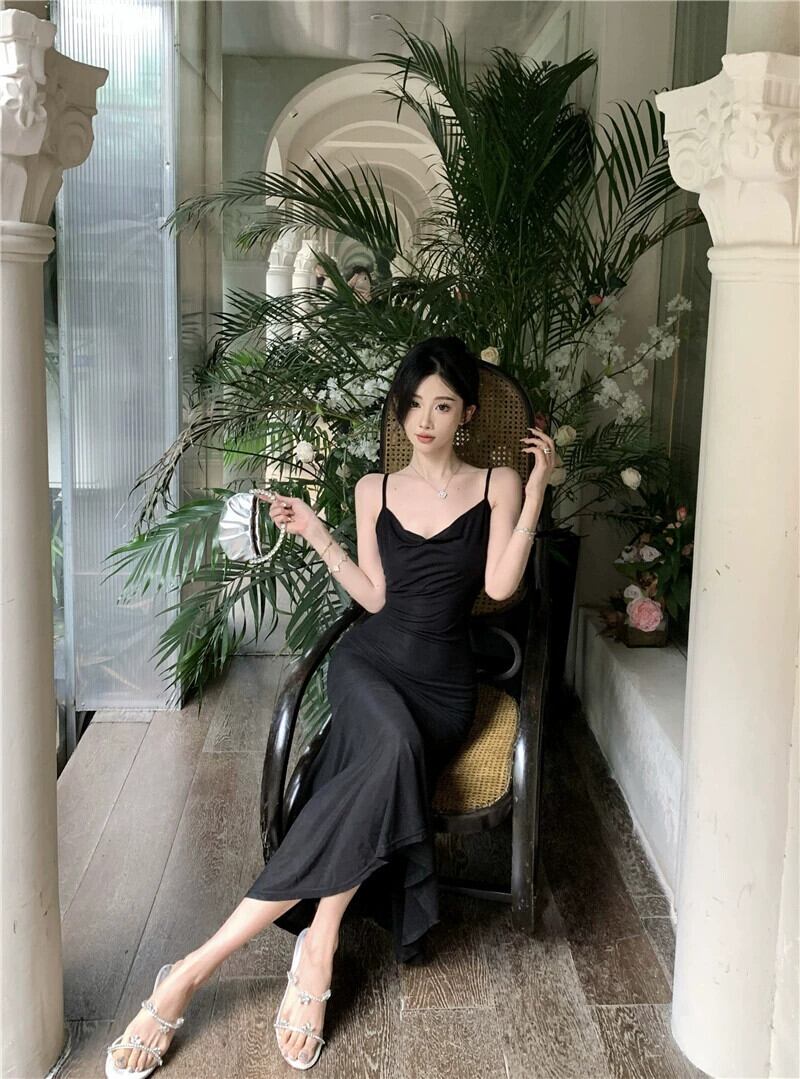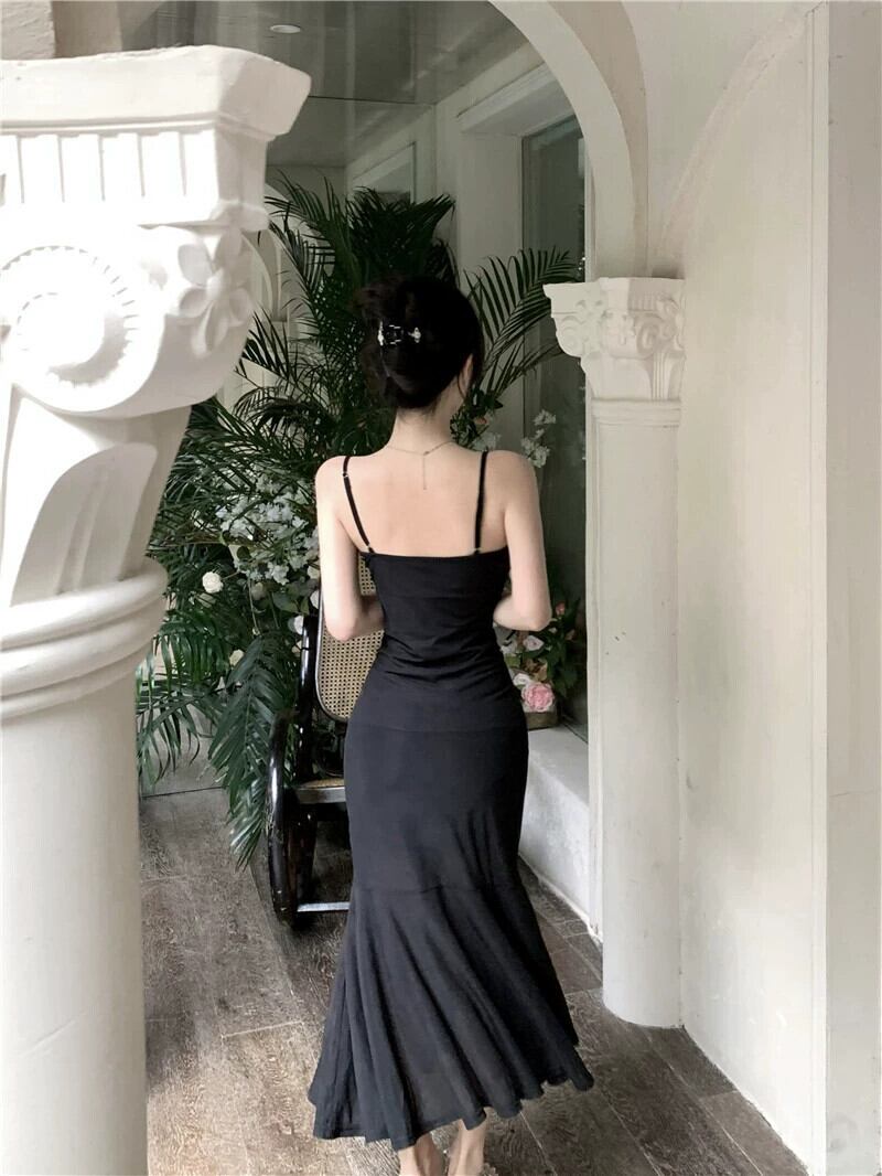 ヘップバーン スタイルのイブニング ドレス、フェミニン、ライト ラグジュアリー ニッチ、ハイエンド フレンチ セクシー ブラック フィッシュテール サスペンダー ドレス yeyij88031130956