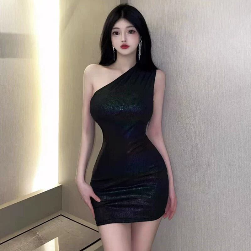 ナイトクラブレディースバーディスコダンスアンカーブラックスパークリンググラデーションセクシーな斜め襟ワンショルダーオフショルダードレス yeyij12732629173