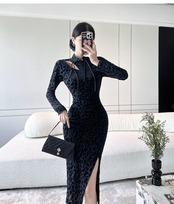 中国風のチャイナドレス 2023 秋の新作改良されたハイエンドの若いスタイルのブラックゴールドベルベットのミドル丈のドレス オータム 秋物 yeyij96725018190