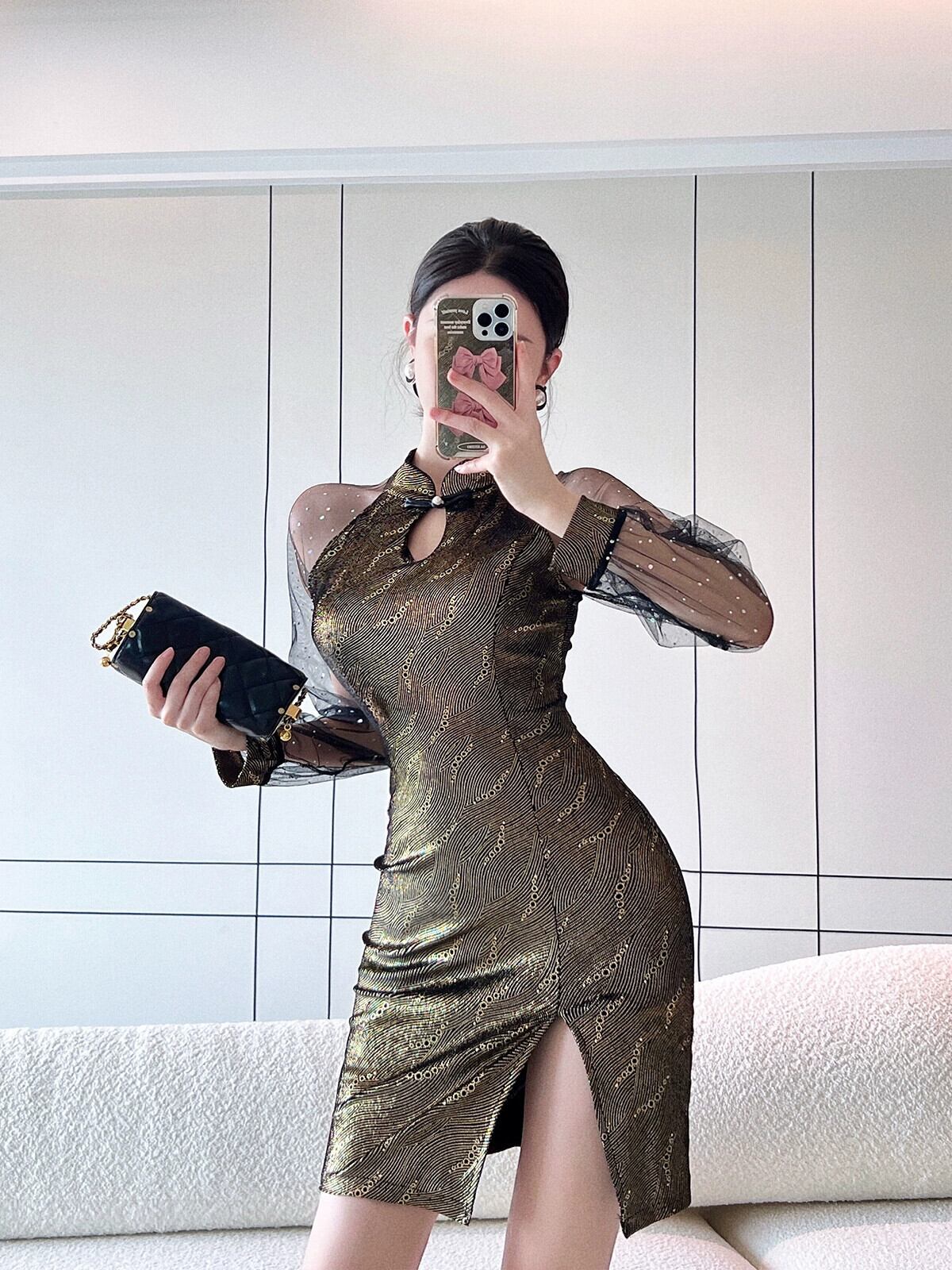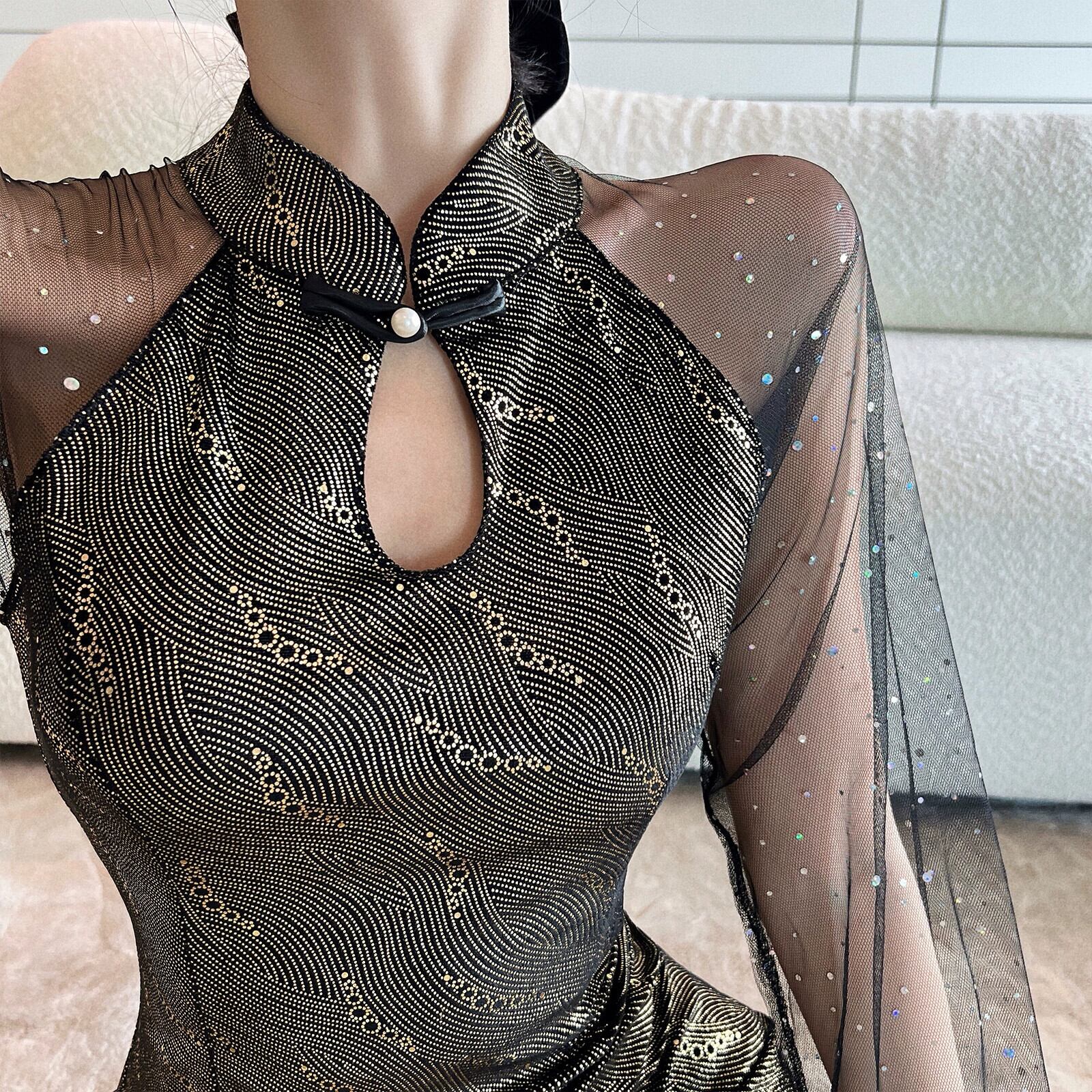 生放送服女性アンカー pogenic 若いスタイルのセクシーなメッシュスプライシングゴールドベルベットブロンズ改良されたチャイナドレス yeyij6371853616