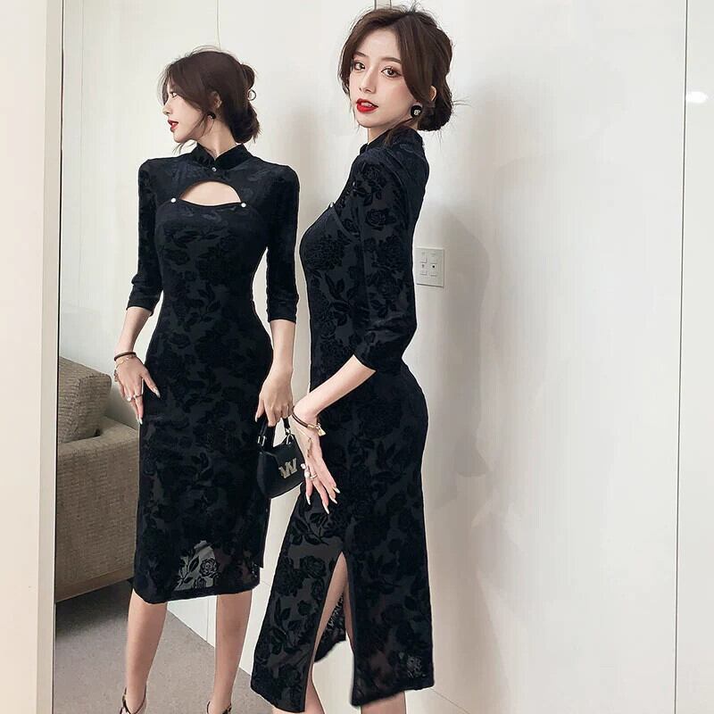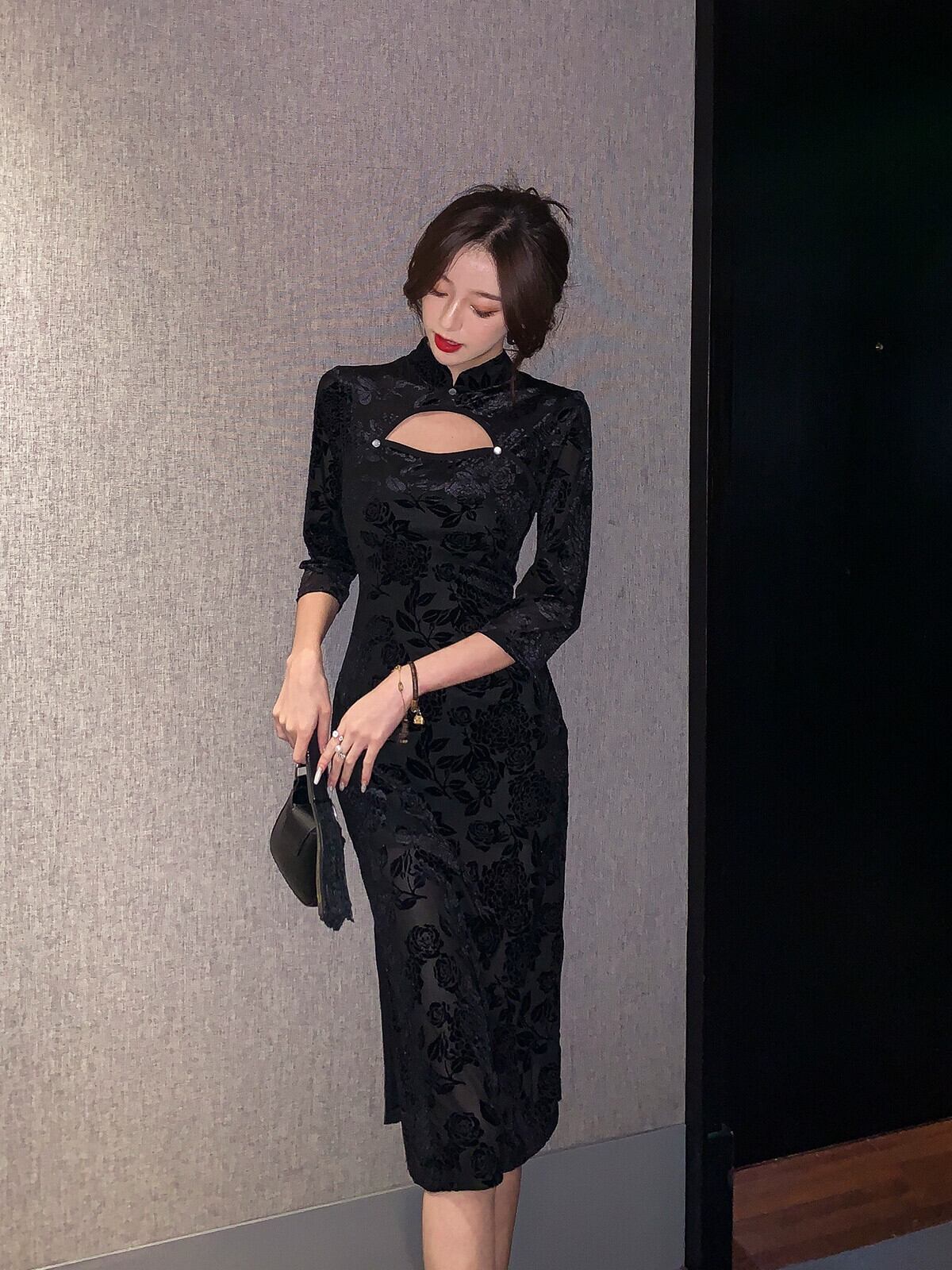 黒チャイナドレス 2023 秋と冬の新しい若いゴールドベルベットのセクシーな中空改良された毎日の中国風のドレス ブラック オータム 秋物 ウィンター 冬物 yeyij34144416229