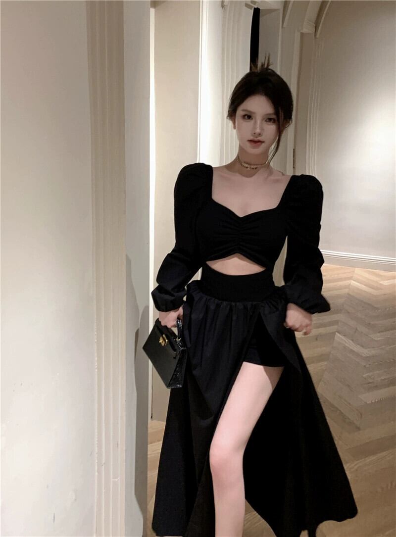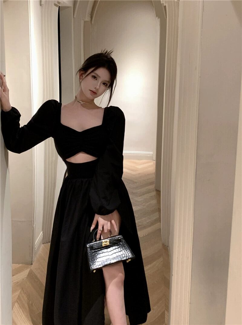 ヘップバーン スタイルのイブニング ドレス、フェミニン、ライト ラグジュアリー ニッチ、ハイエンドのフランスのセクシーな黒の見事なスクエア ネック ドレス ブラック スクウェア yeyij66655486490
