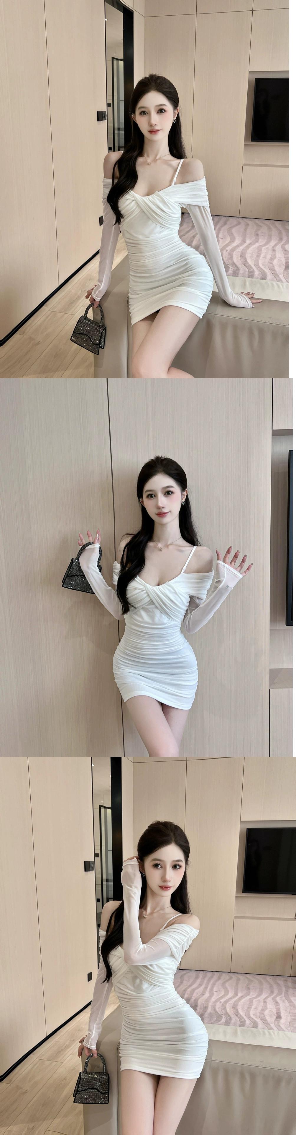 生放送服女性アンカー pogenic 純粋な欲望ナイトクラブメッシュセクシーなワンライン襟オフショルダー長袖サスペンダードレス ロング ピュア yeyij77308179214