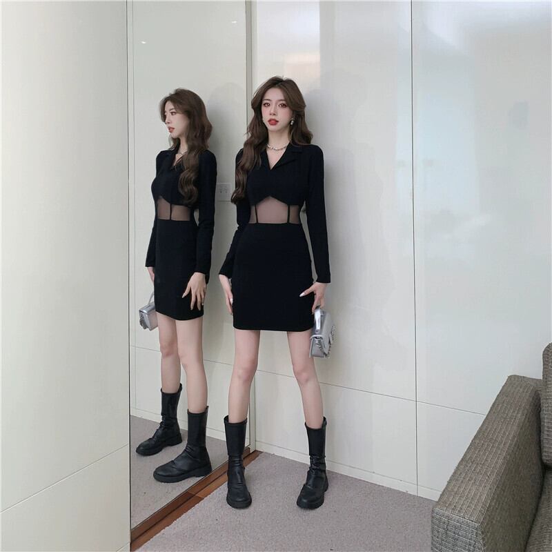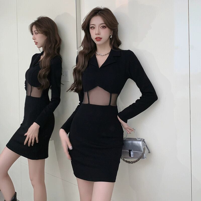インターネット有名人ライブダンスアンカー服女性 pogenic 黒セクシーな中空ウエスト露出メッシュスプライシングヒップドレス ブラック yeyij79416229566