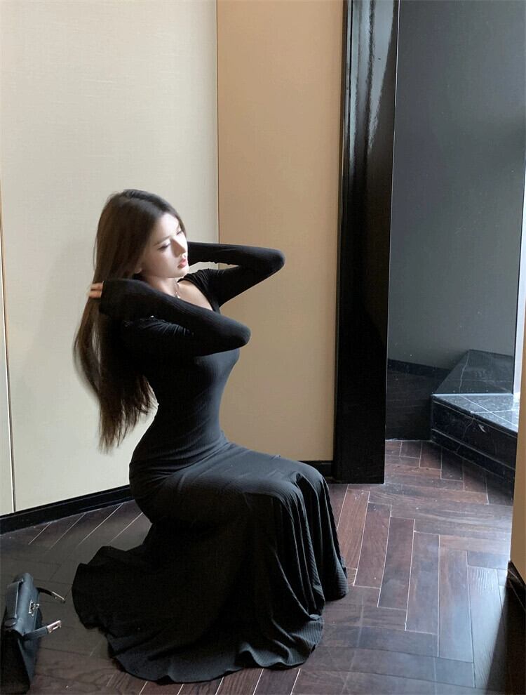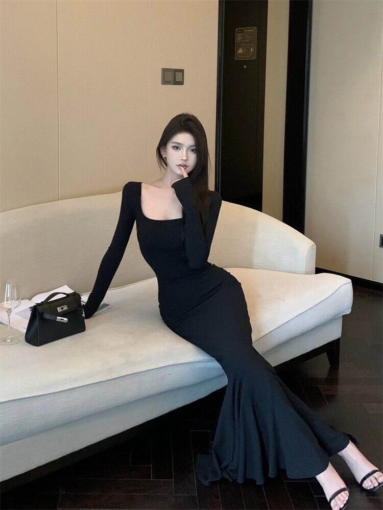 ドレス、女神スタイルの秋のハイエンド黒のセクシーなスクエアネックボトリングスカート、スリムフィッシュテールフロアレングススカート ブラック オータム 秋物 スクウェア yeyij7392052456