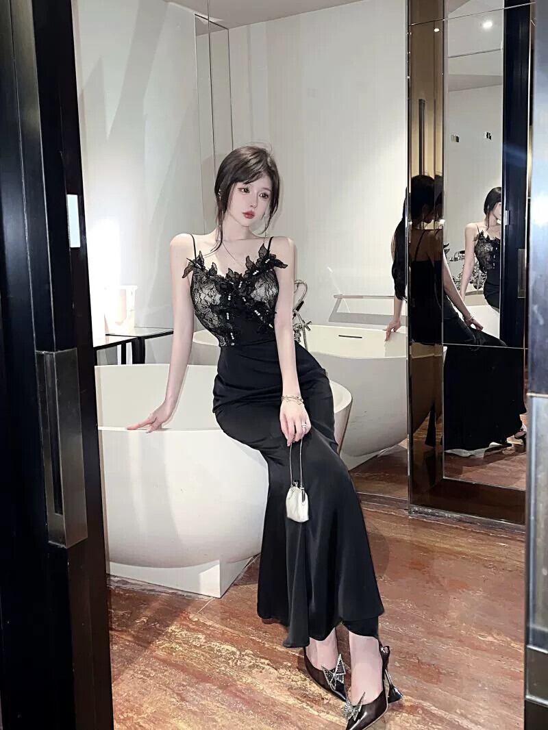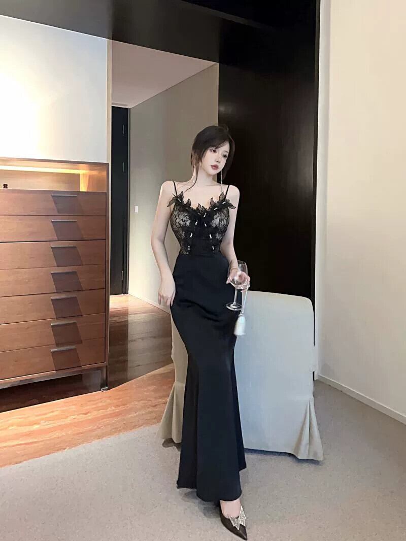 ヘップバーン スタイルのイブニング ドレス、フェミニン、ライト ラグジュアリー ニッチ、ハイエンド フレンチ セクシー レース スプライシング サスペンダー ドレス yeyij78369536690