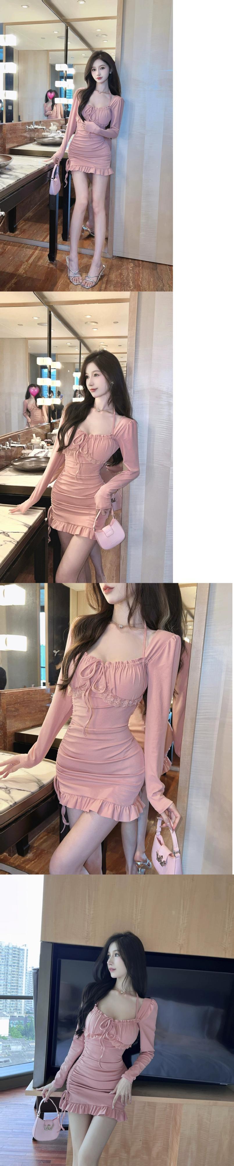 生放送服女性アンカー pogenic ナイトクラブ純粋な欲望スタイルフレンチセクシーなスクエアネック長袖底ホルタードレス ロング ピュア スクウェア yeyij44514708589