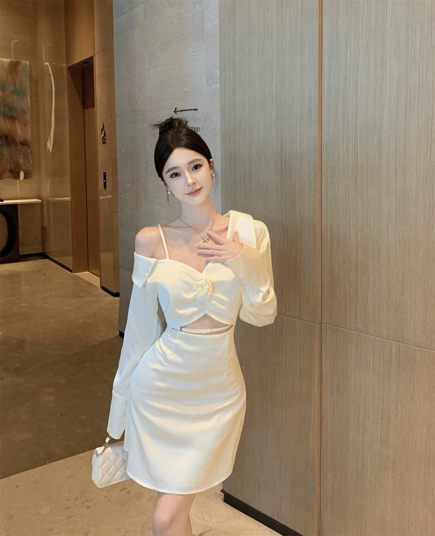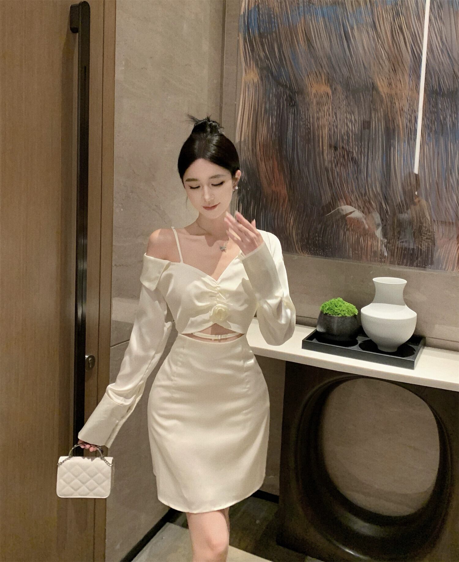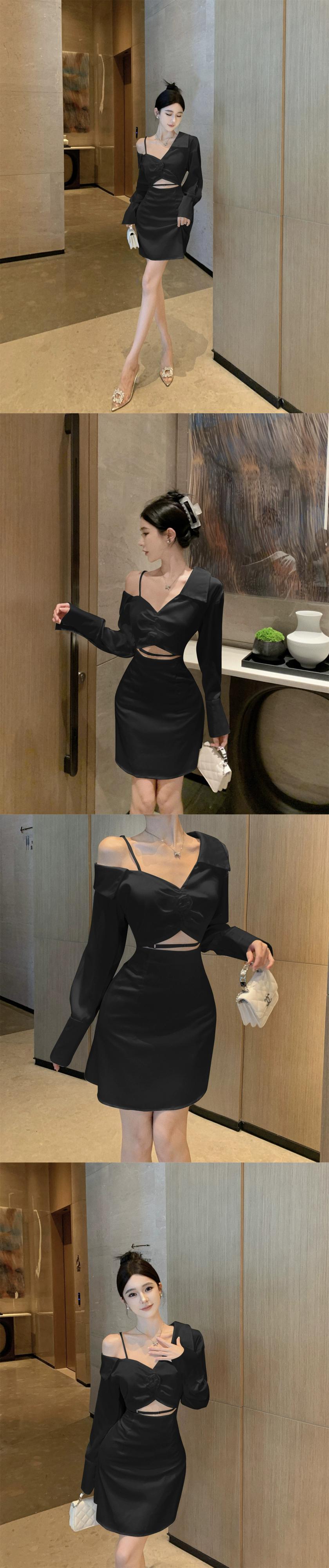 白いシャツドレス 2023 新しい女性の秋のデザインニッチハイエンド小柄なセクシーなワンショルダーオフショルダードレス ホワイト オータム 秋物 yeyij89152788793