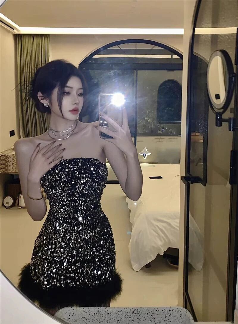 純粋な欲望フレンチフェザーワンショルダーチューブトップドレスショートイブニングドレスハイエンドセクシーなスパンコールミニドレス yeyij86420357516