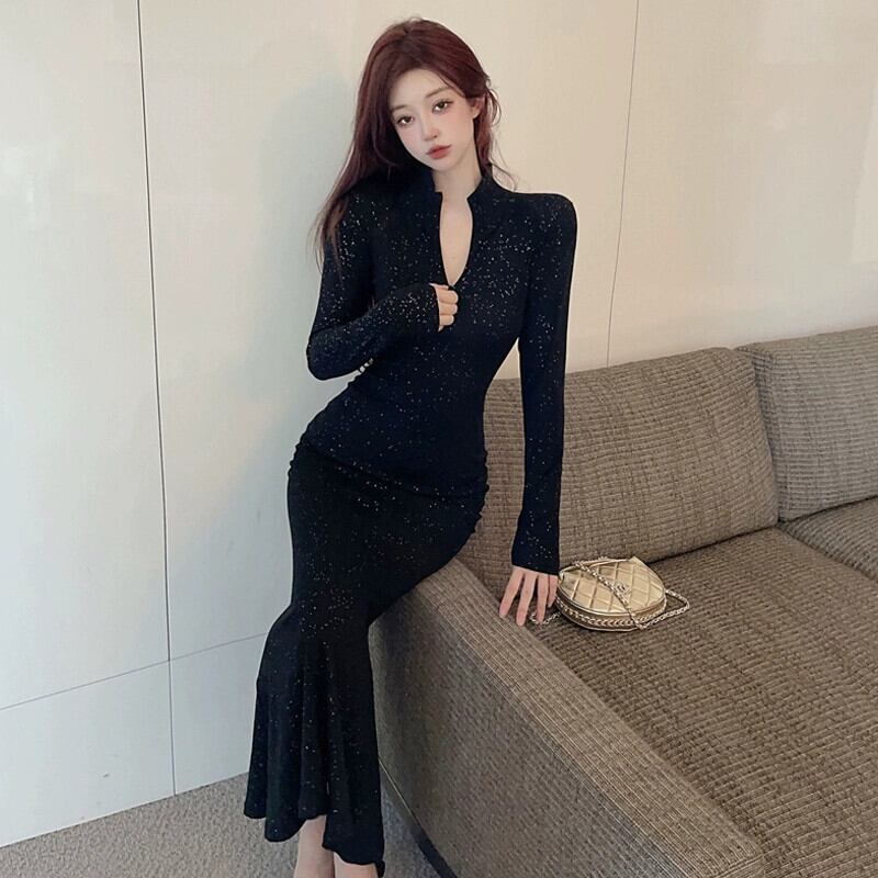 イブニングドレス、高級でエレガント、ハイグレードな女性、キラキラロングスカート、エレガントな長袖スリムドレス yeyij98753125203
