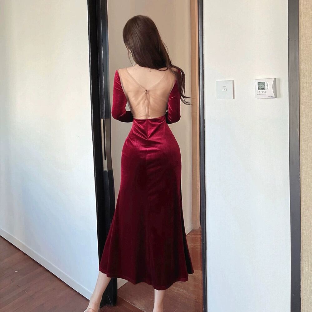 イブニングドレス、ハイエンドでエレガント、ハイエンドナイトクラブセクシーなメッシュスプライシング長袖ゴールドベルベットドレス女性 ロング yeyij18379768103