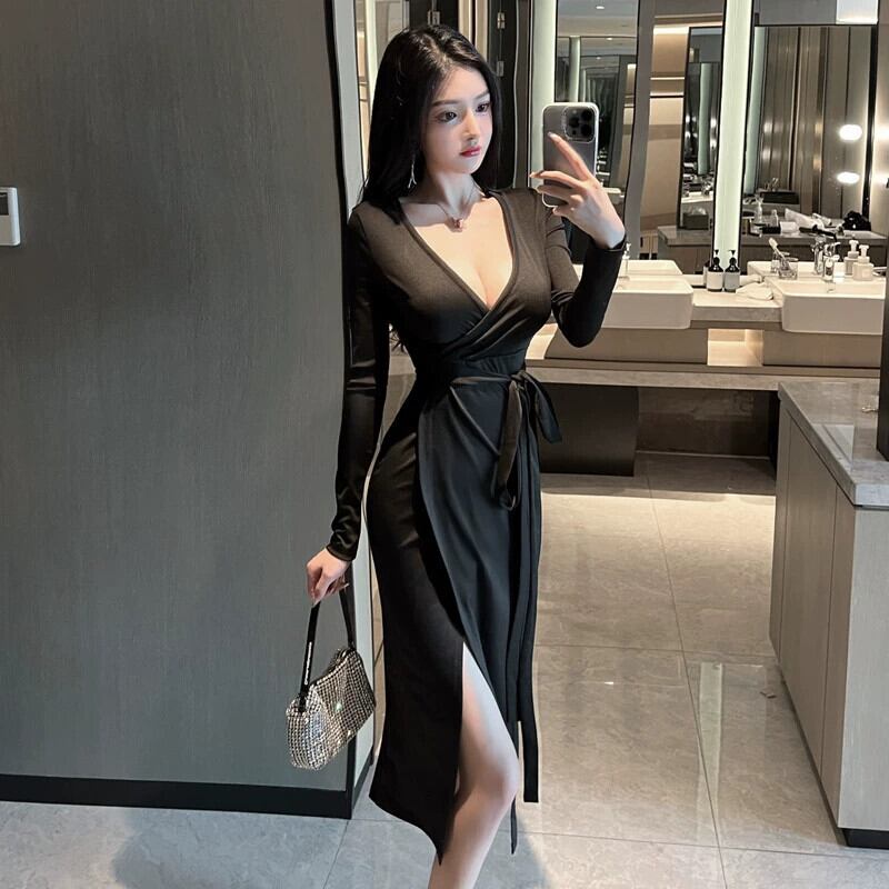 ナイトクラブレディースナイトクラブ作業服、作業服、セクシーなローカットVネックウエスト痩身長袖ドレス ロング yeyij93832374297