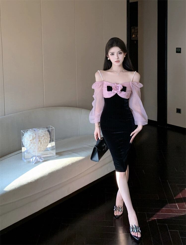 ヘップバーン風イブニングドレス、フェミニン、軽やか、高級感、ニッチ、ハイエンド、美しいフレンチセクシースクエアネック長袖ドレス ロング スクウェア yeyij57620749664