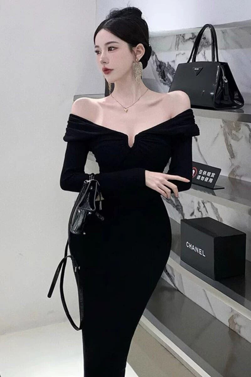 ヘップバーンスタイルのイブニングドレス、フェミニン、ライト、ラグジュアリー、ニッチ、ハイエンド、フレンチセクシーなブラックワンショルダーオフショルダードレス yeyij44506821608