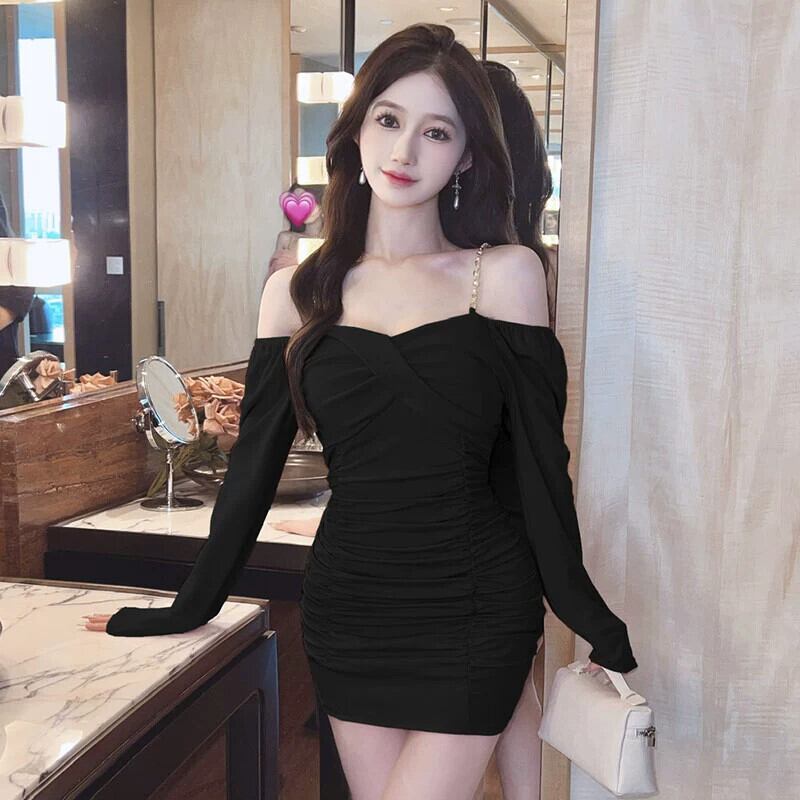 生放送服女性アンカー pogenic ナイトクラブ純粋な欲望セクシーなワンショルダー長袖オフショルダー チェーン サスペンダー ドレス ロング ピュア yeyij6457704265