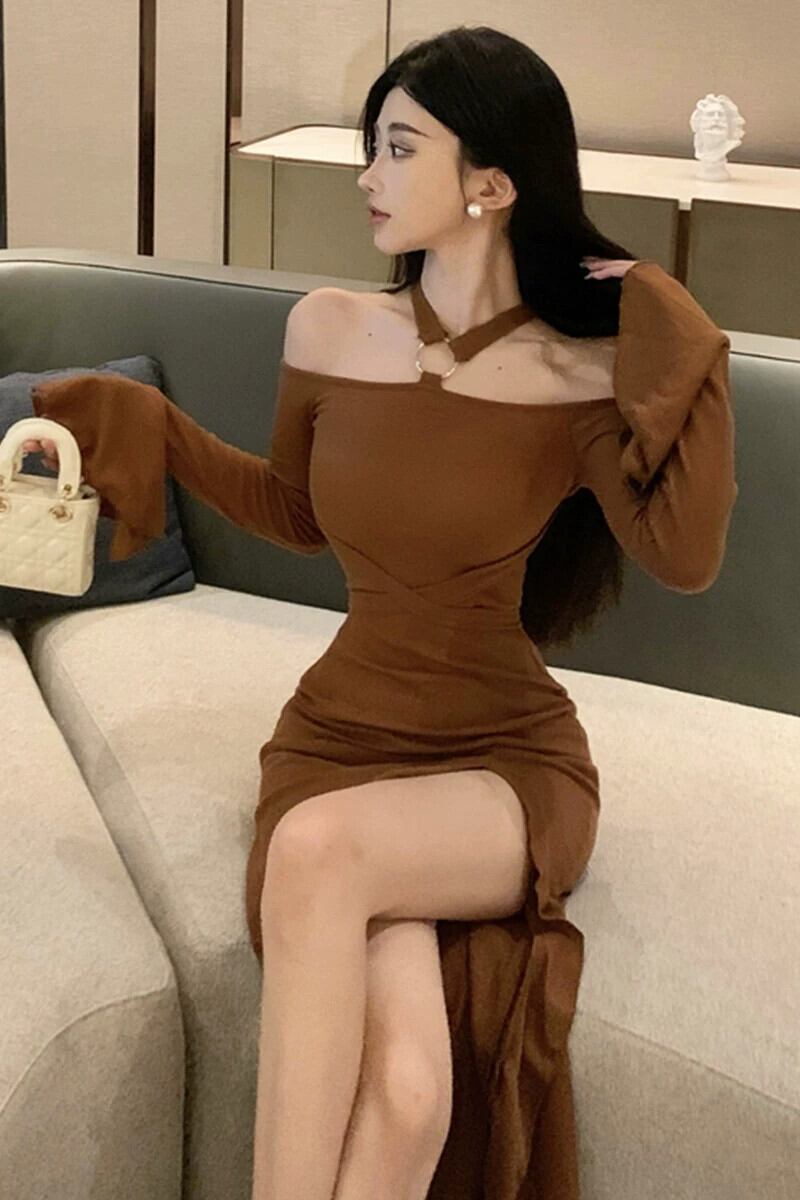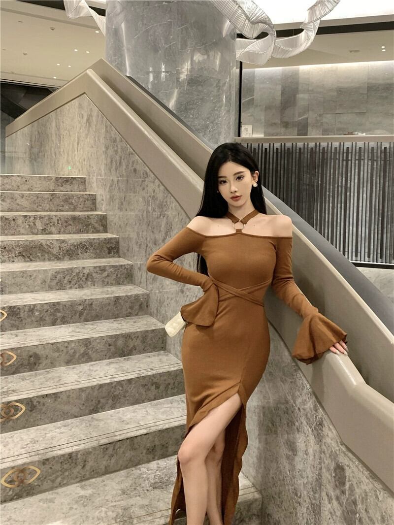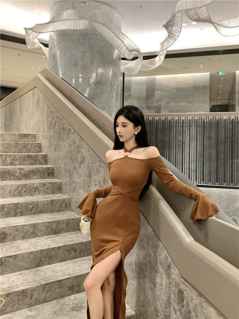 イブニングドレスロングドレス女性ハイエンドフレンチスタイルの女神スタイルのセクシーなワンショルダーベルスリーブホルターネックドレス yeyij9447880256