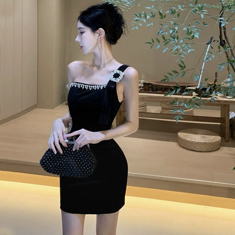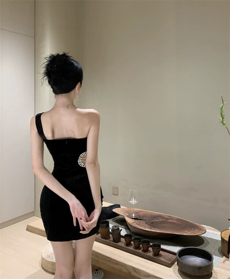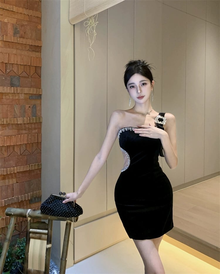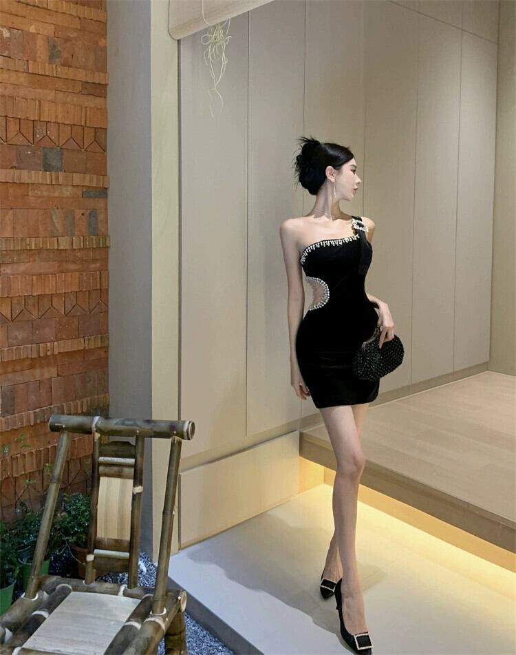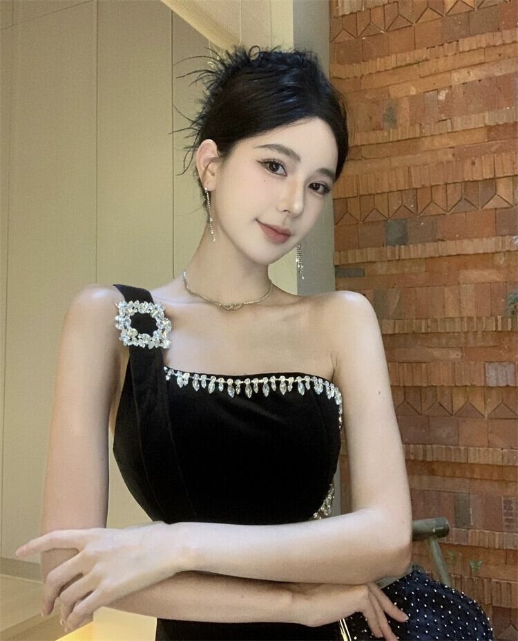ヘプバーンスタイルのフレンチブラックイブニングドレスの女性、ハイエンドのダイヤモンドがちりばめられたゴールドベルベットのセクシーなワンショルダーストラップレスドレス yeyij80292924785