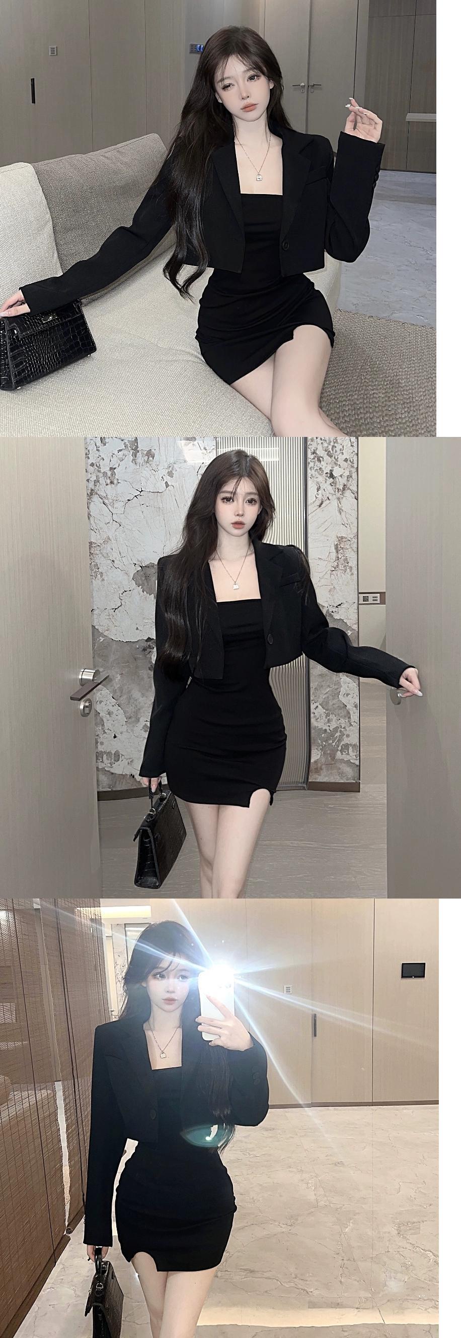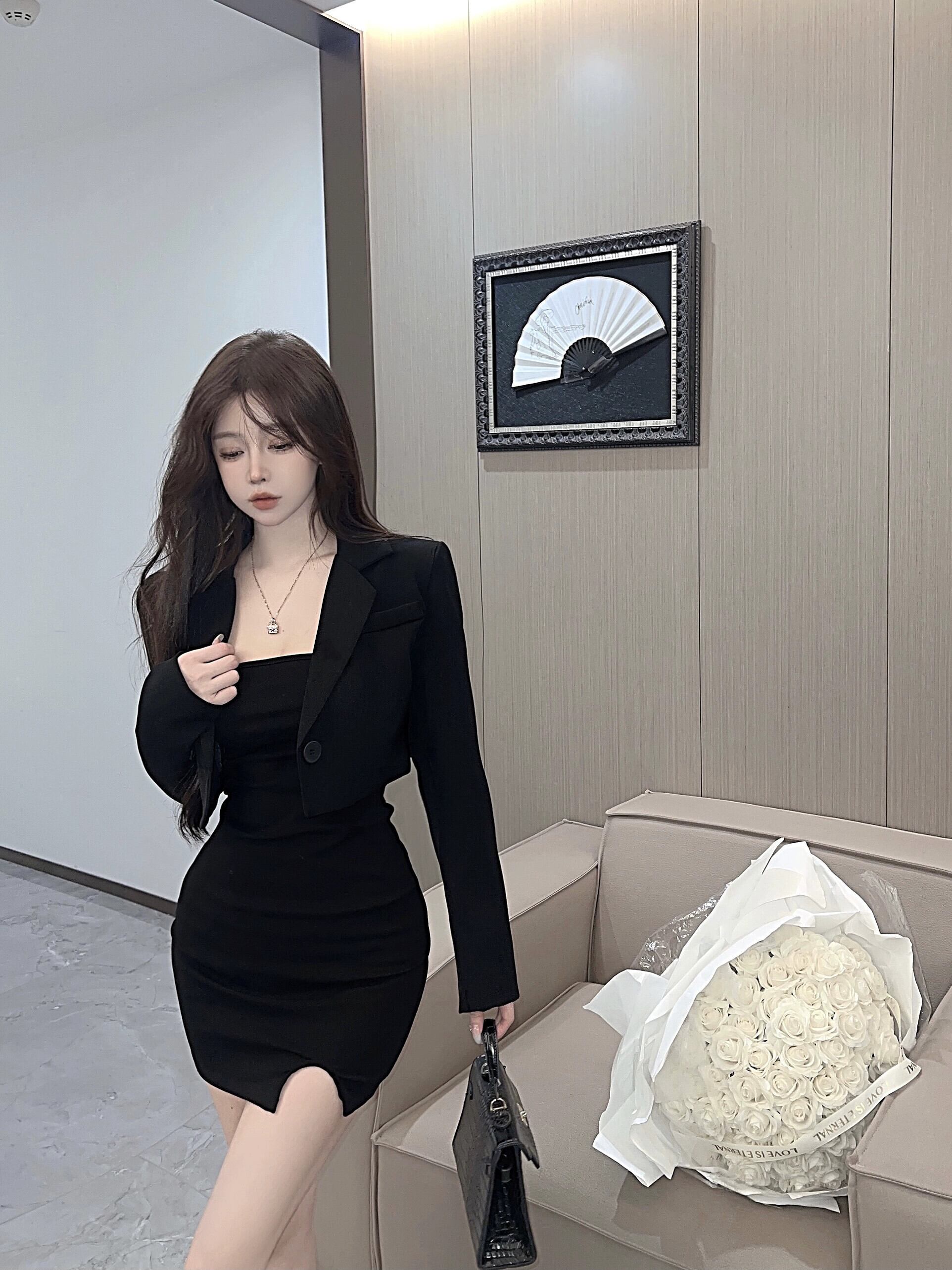 YOUAYOUSHA スーツ女性初秋、ハンサムなショートブレザー + セクシーなサスペンダードレス 2 点セット オータム 秋物 yeyij1863342153