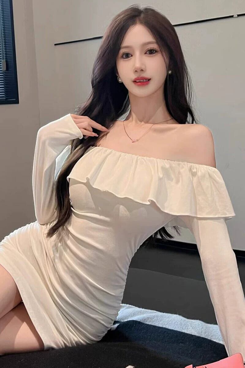 生放送服女性アンカー pogenic 純粋な欲望甘いネクタイセクシーなフリルワンショルダー長袖オフショルダードレス ロング 大人ガーリー スウィート キュート カジュアル ピュア yeyij37038021814