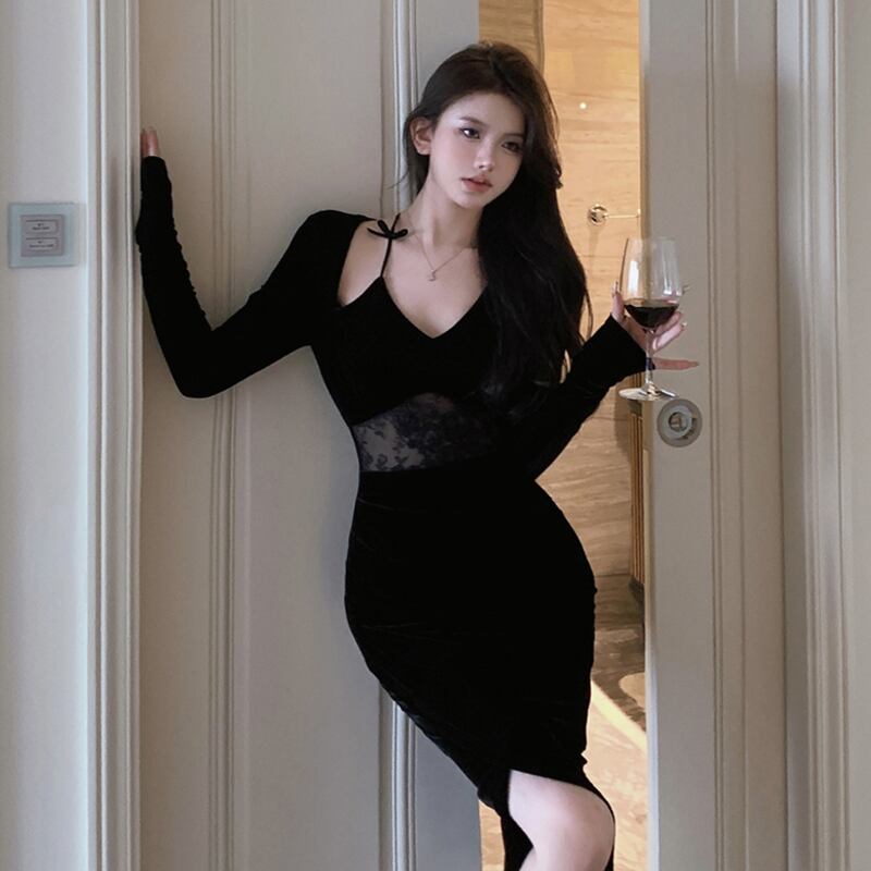 イブニングドレスフレンチブラックライト高級ニッチハイエンド気質痩身セレブホスト長袖ホルタードレス ロング yeyij63476567400