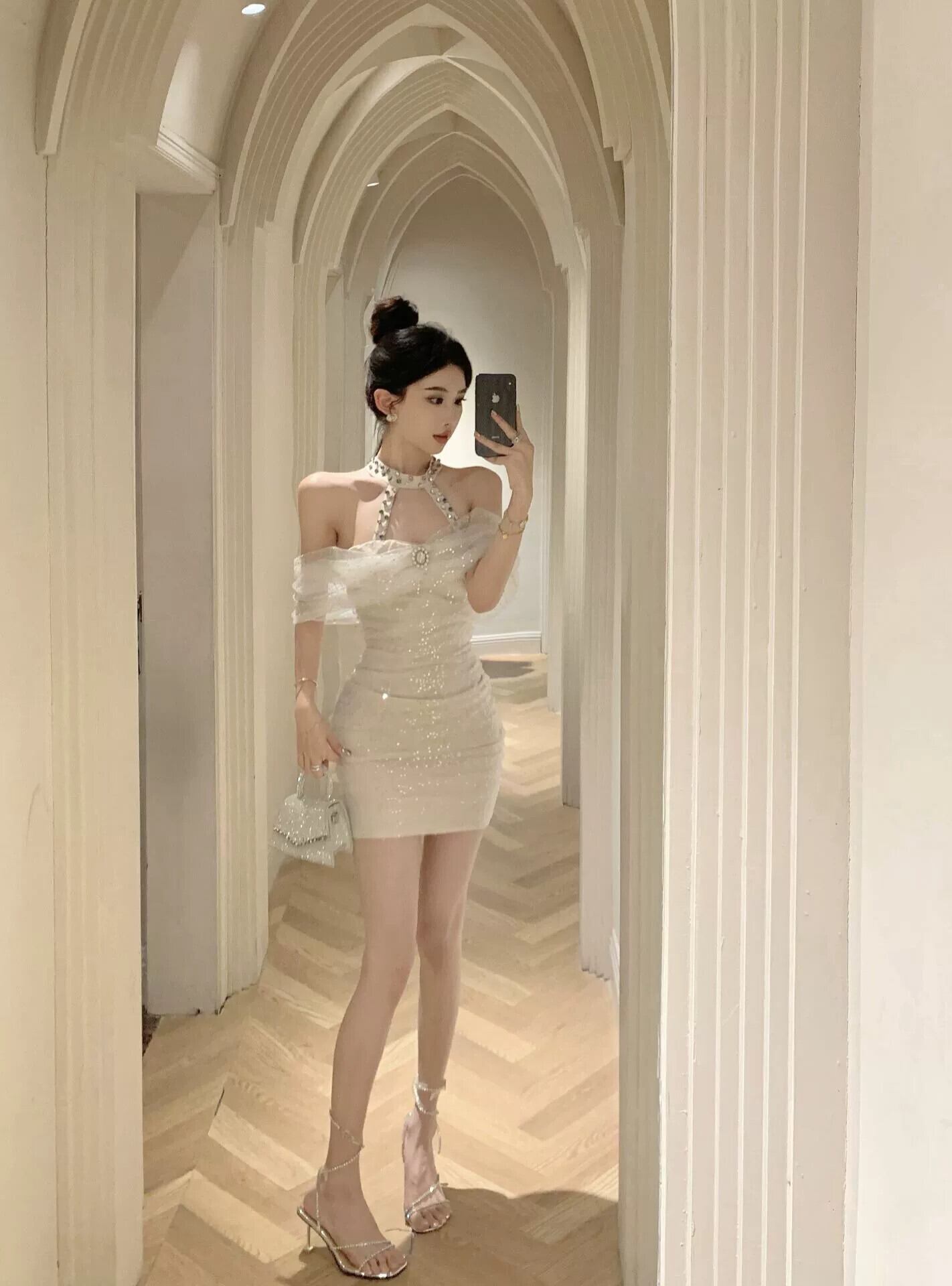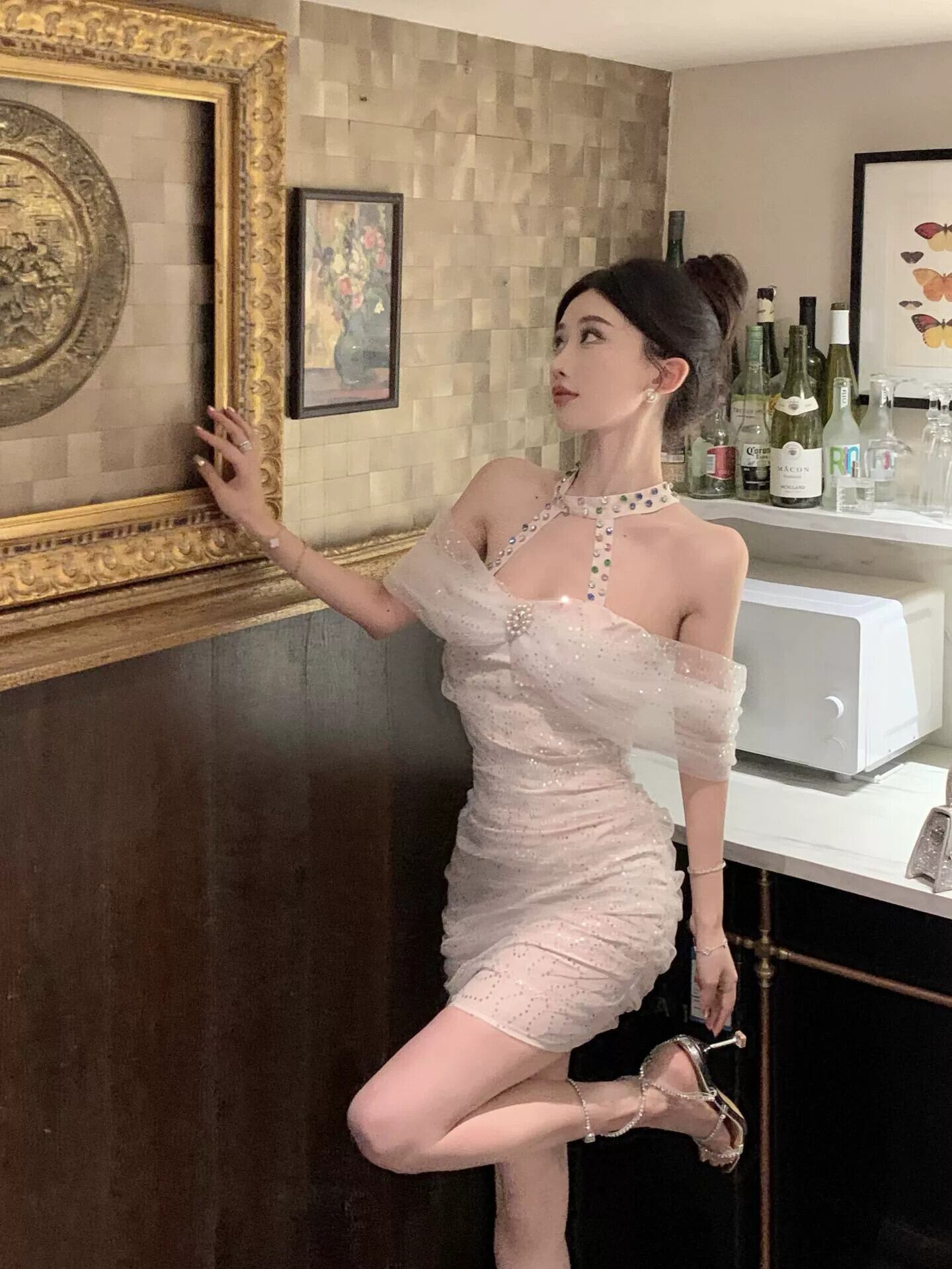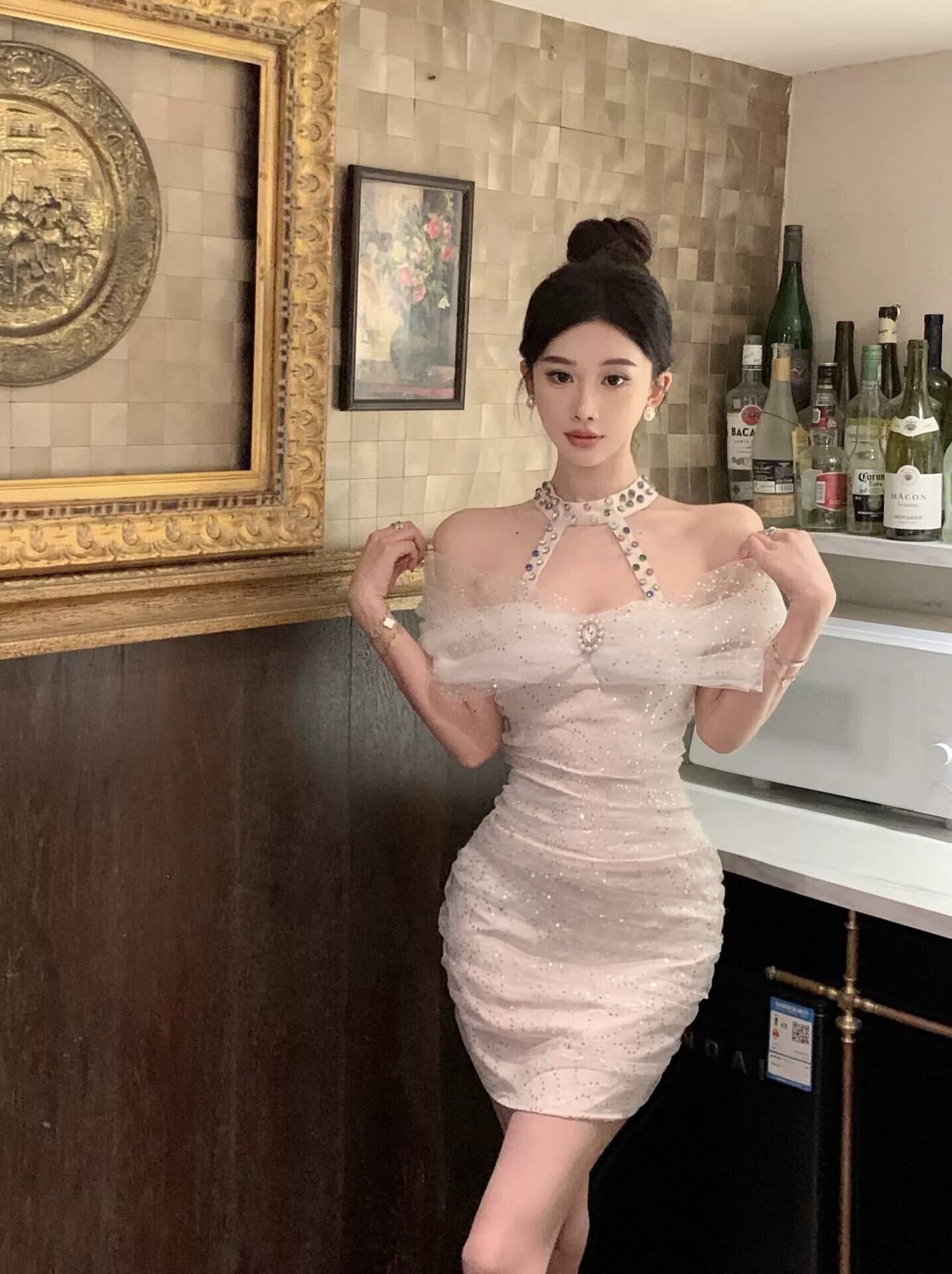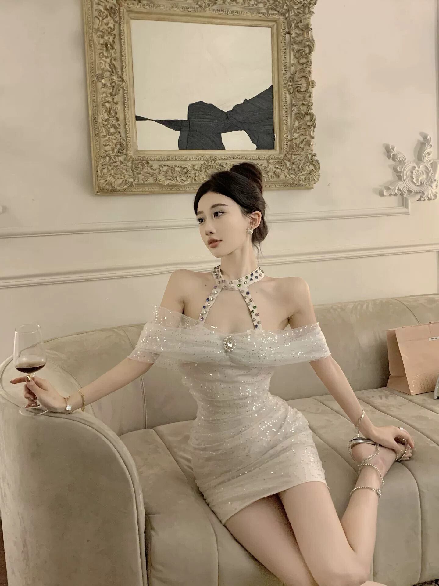 フレンチホワイトダイヤモンドチェーンホルタードレス女性スーパーフェアリーメッシュハイエンド社交界デートパーティー誕生日ドレス yeyij22453197400
