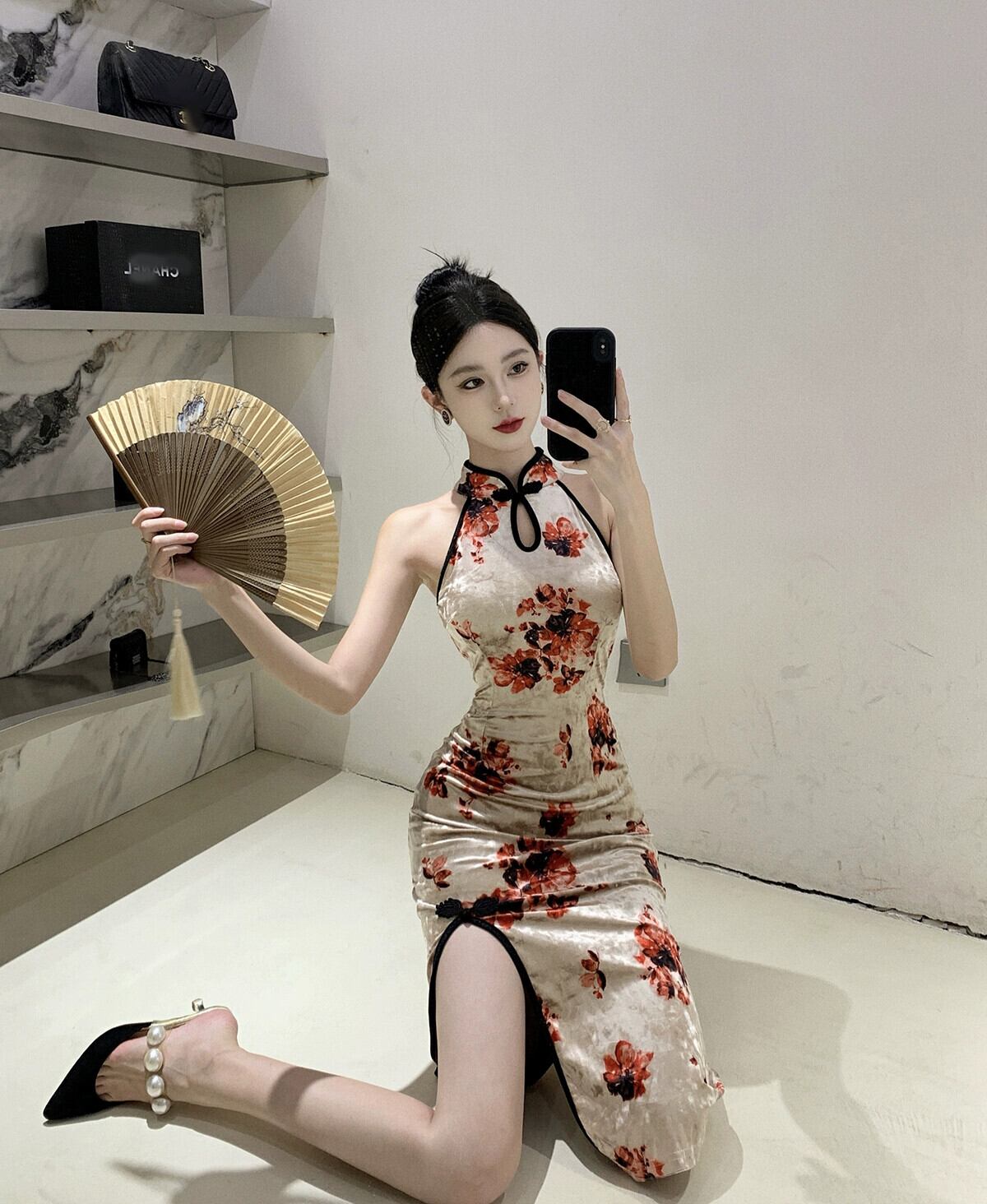 生放送服女性アンカー pogenic ハイエンドヤングスタイルセクシーなスリットゴールドベルベット修正バージョンチャイナドレス yeyij33545726338