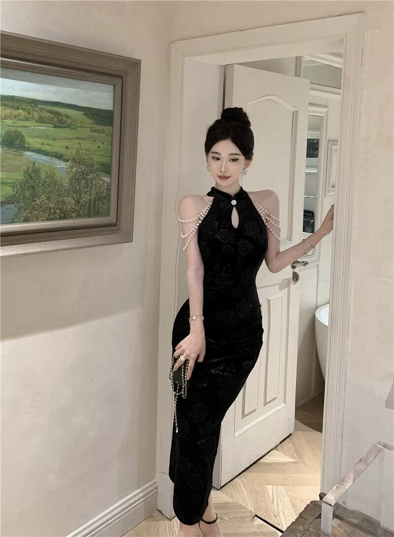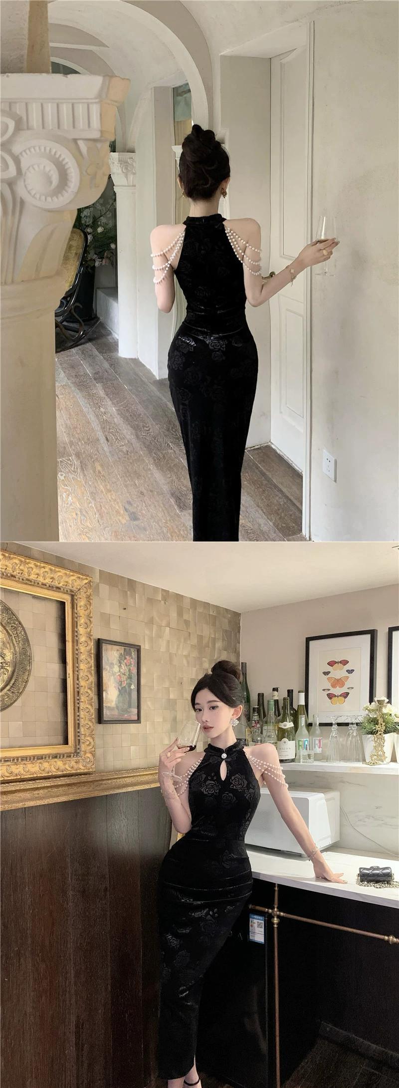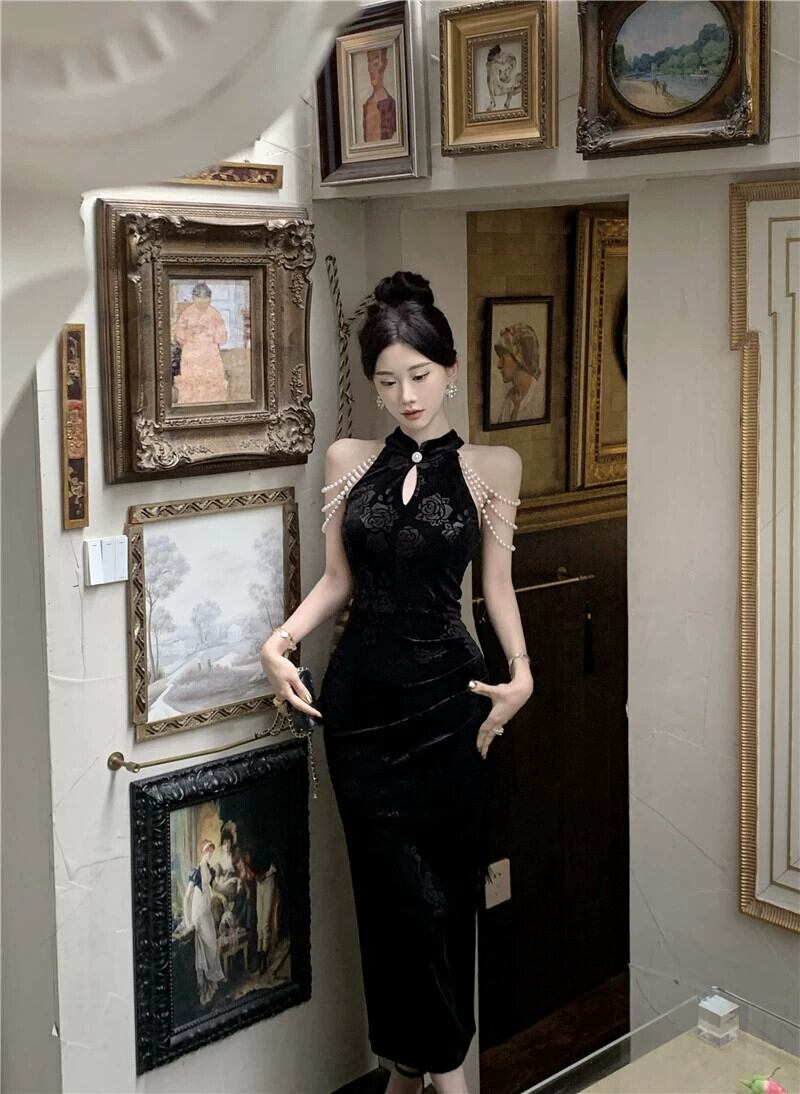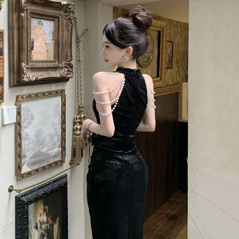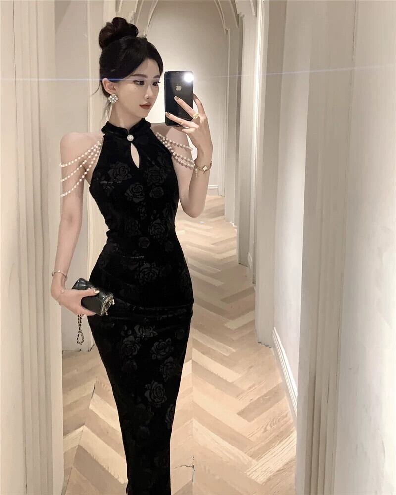中国風のイブニングドレスの女性、高級中国風のゴールドベルベットエンボス加工年次パーティーセクシーなチャイナドレスの改良版 yeyij11401516967