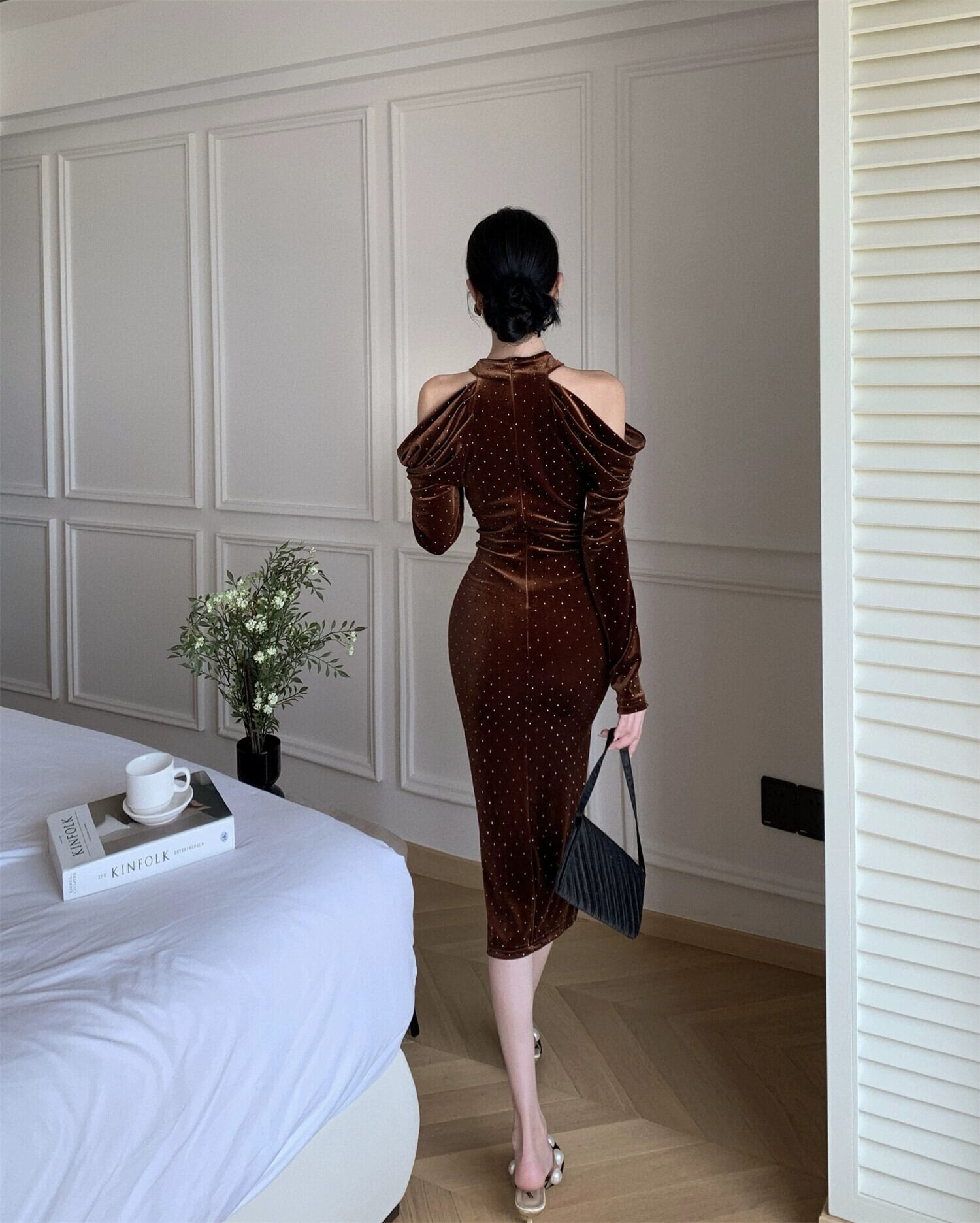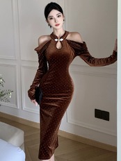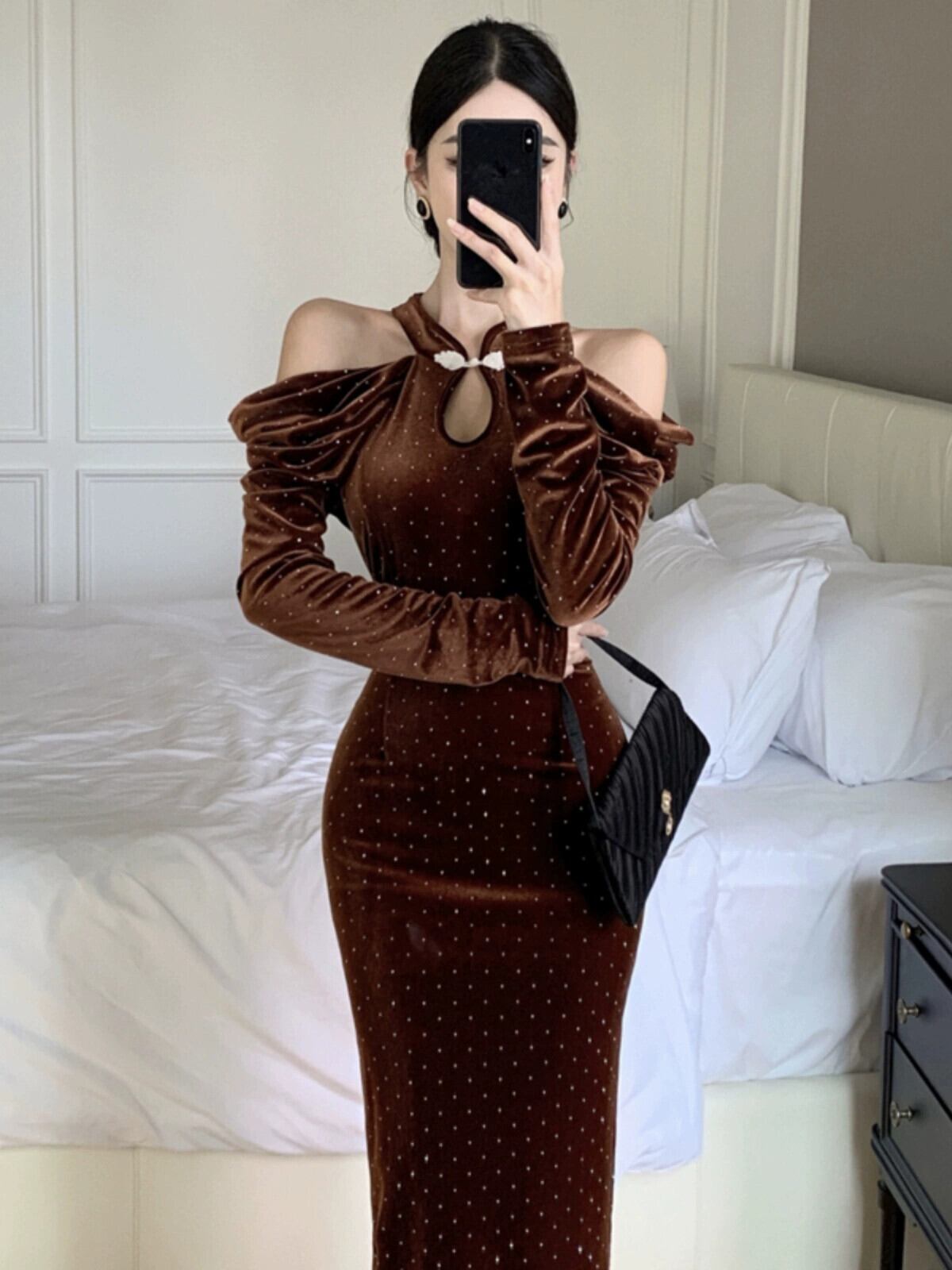 黒のイブニングドレスハイエンドのライト高級ニッチ女性のハイエンドの新しい中国風のゴールデンベルベットのセクシーなオフショルダーホルターネックドレス ブラック yeyij87153149903