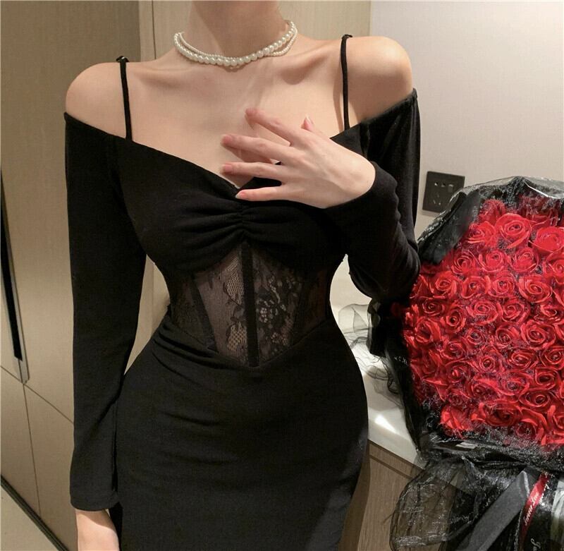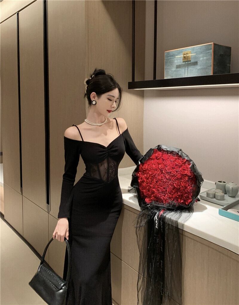 ヘップバーン スタイルのイブニング ドレス、フェミニン、ラグジュアリー、ニッチ、高級フレンチ ドレス、セクシーなワンショルダー サスペンダー ドレス yeyij76399225099