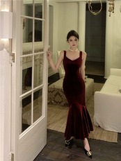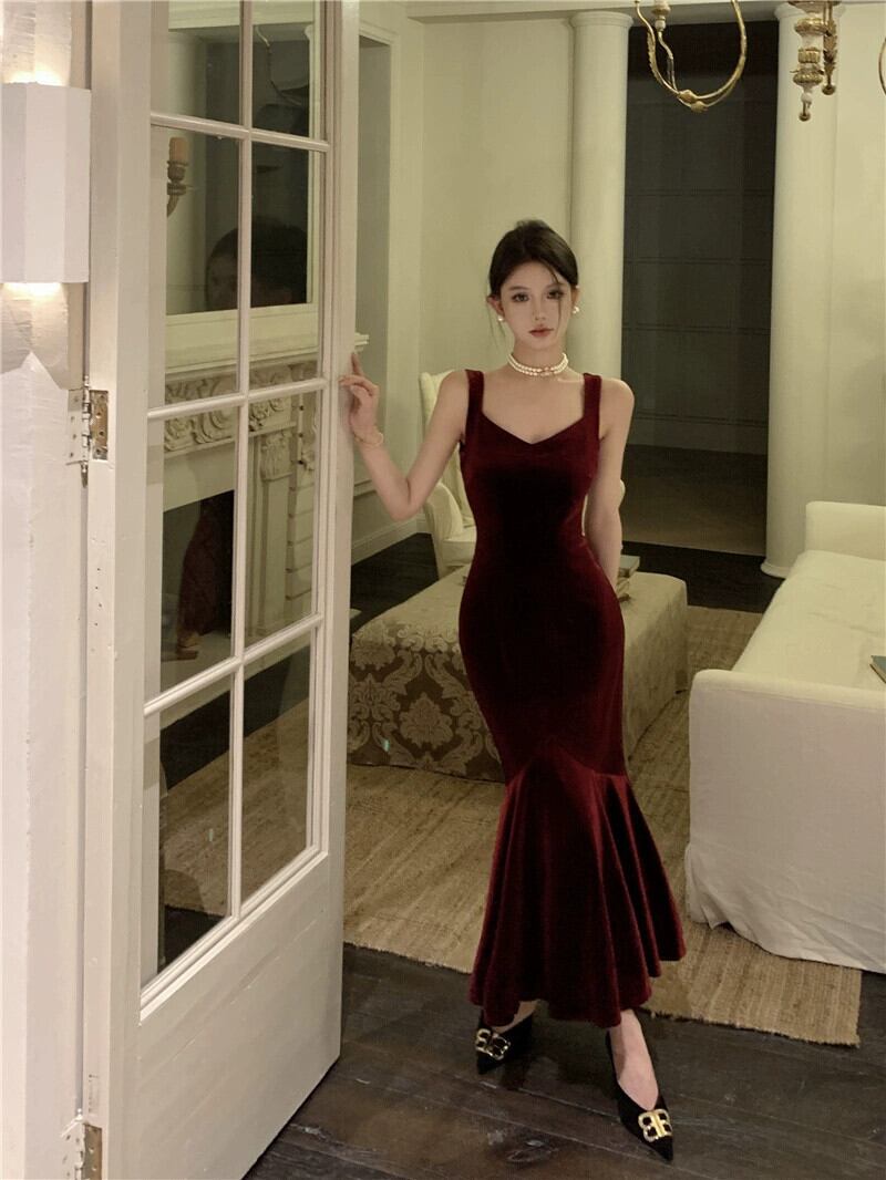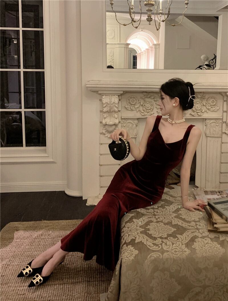 バンケットイブニングドレス、高級フランス年次パーティートーストドレス、バーガンディゴールドベルベットのミドルレングスサスペンダードレス yeyij15613179876