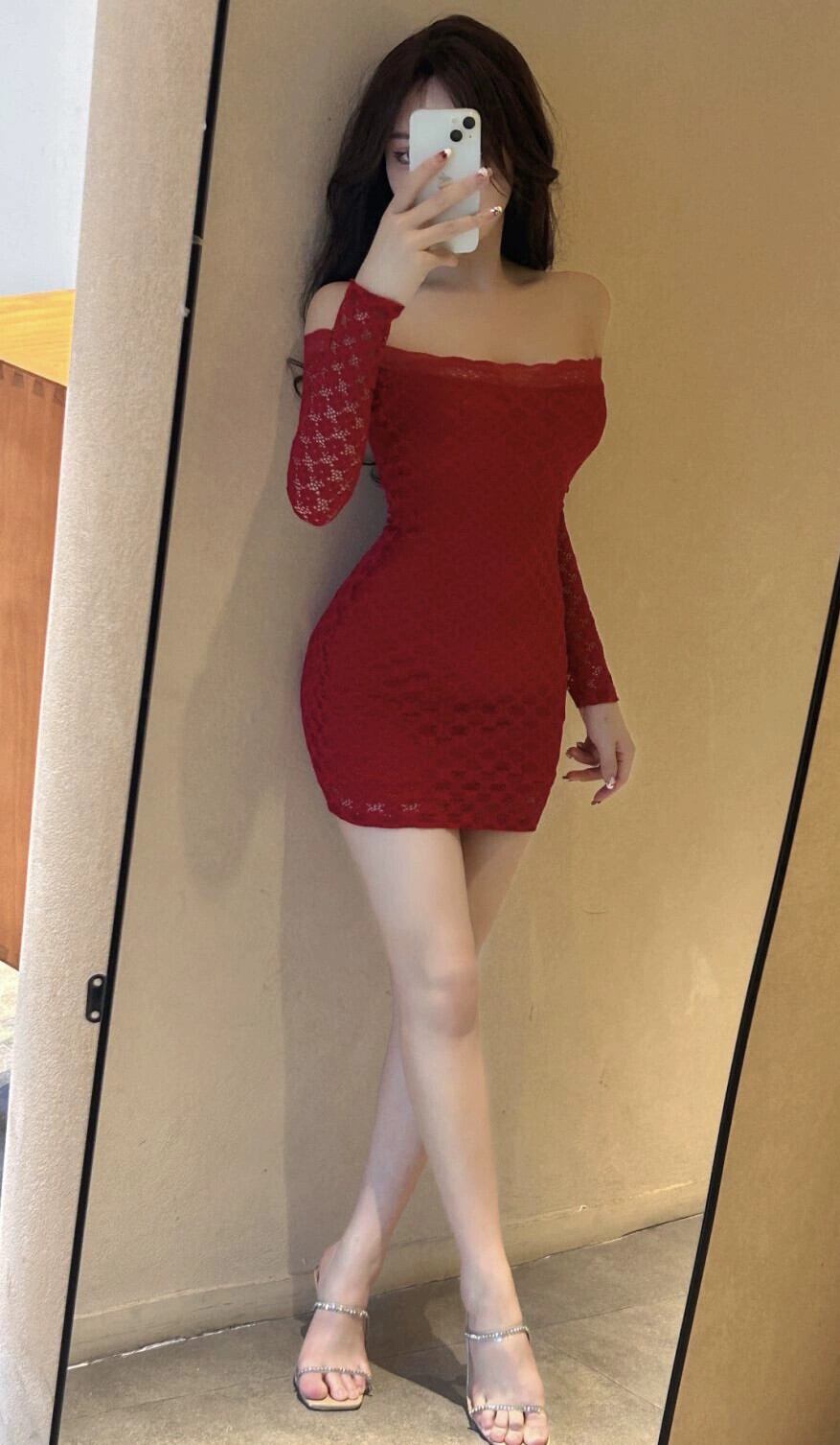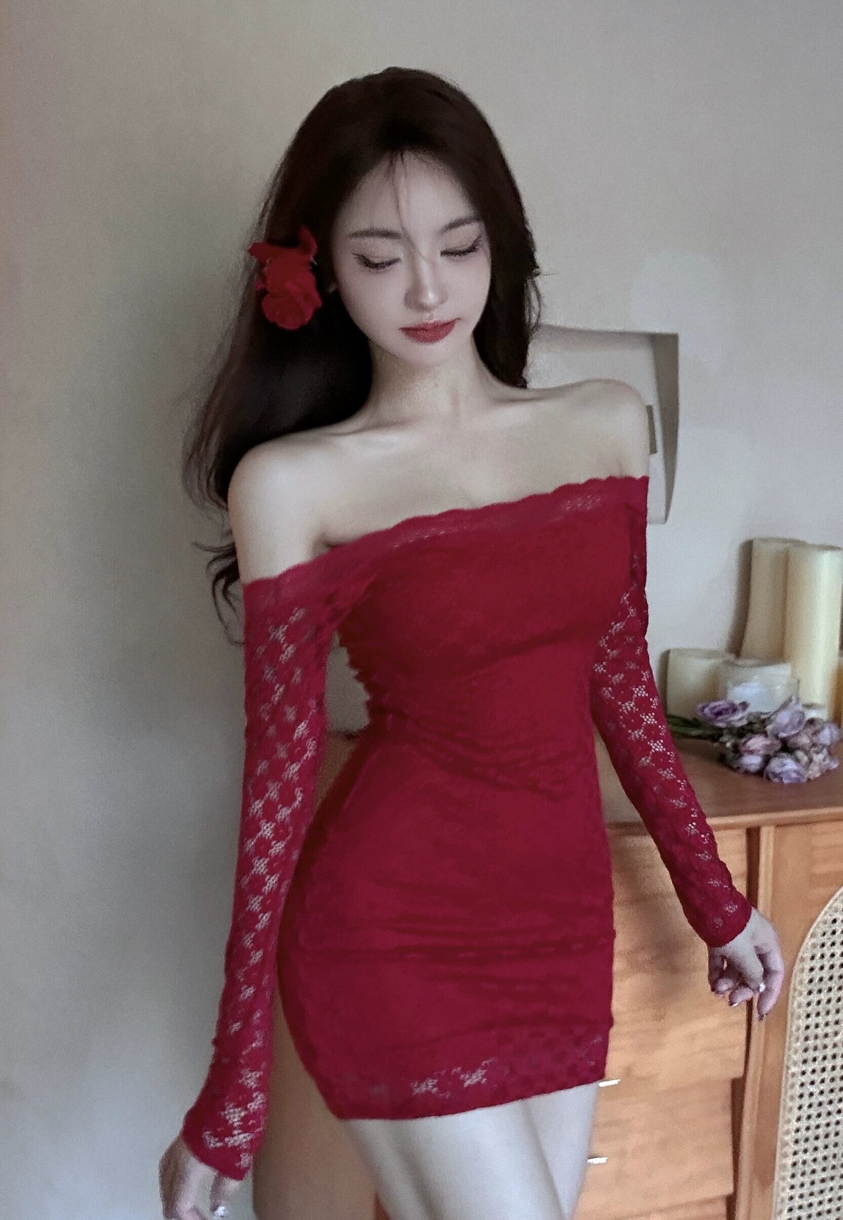 生放送女性アンカーの服新年とクリスマスの純粋な欲望のセクシーなワンラインカラーレースオフショルダードレス ピュア yeyij96735843300