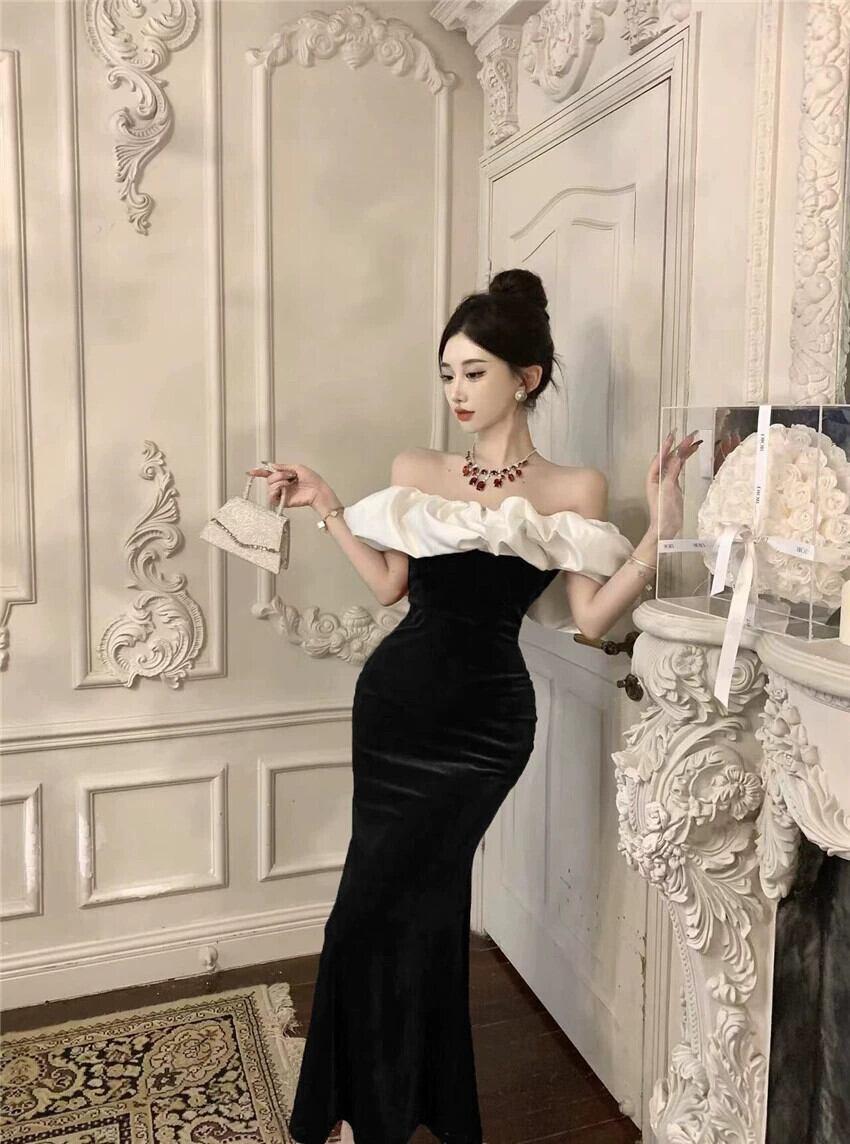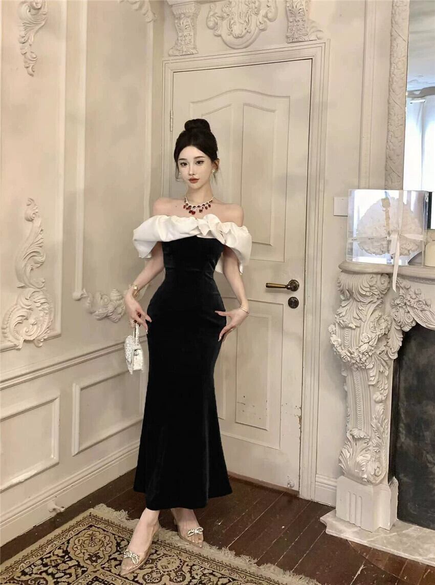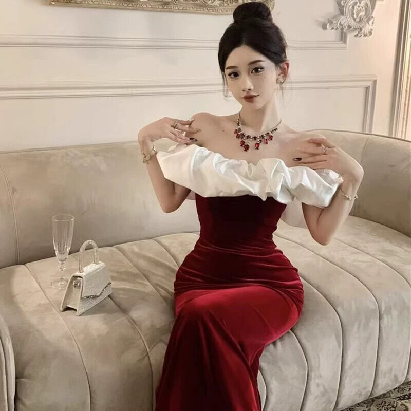 フレンチイブニングドレス女性、高級年末パーティー宴会気質トーストドレス、セクシーなワンショルダーチューブトップドレス yeyij47236556403