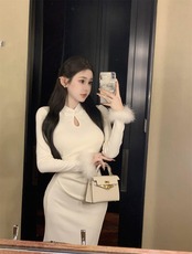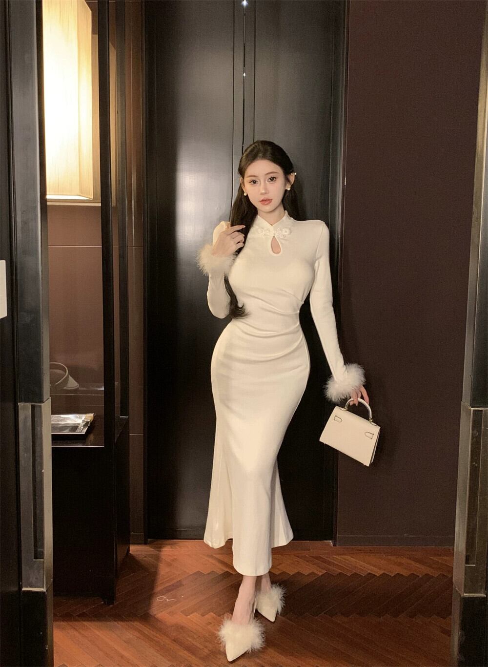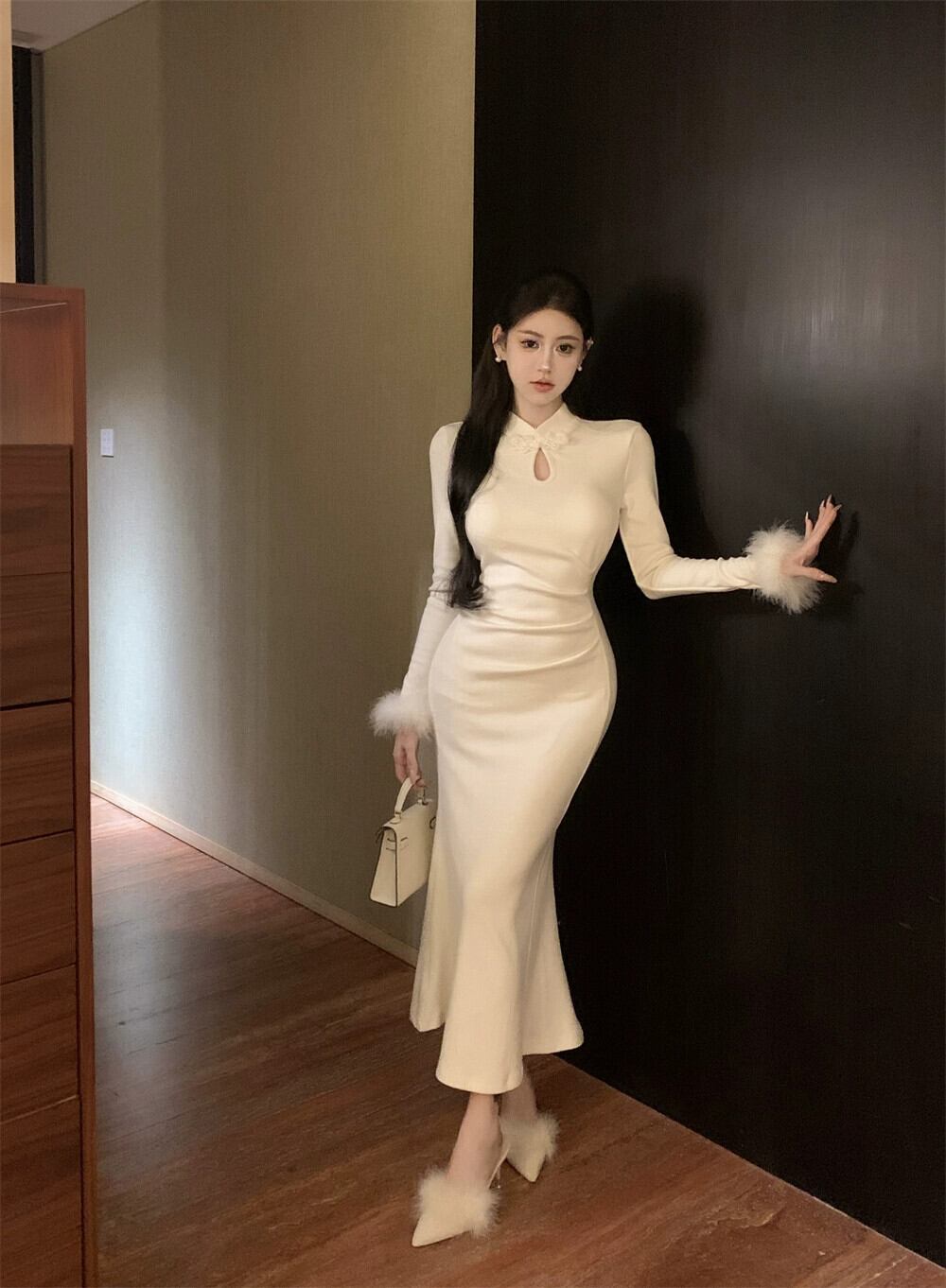 チャイナドレス女性の新しい中国風の秋と冬の若い国民的ファッションセクシーな中国風の毛皮の袖底ドレス オータム 秋物 ウィンター 冬物 yeyij19734710068